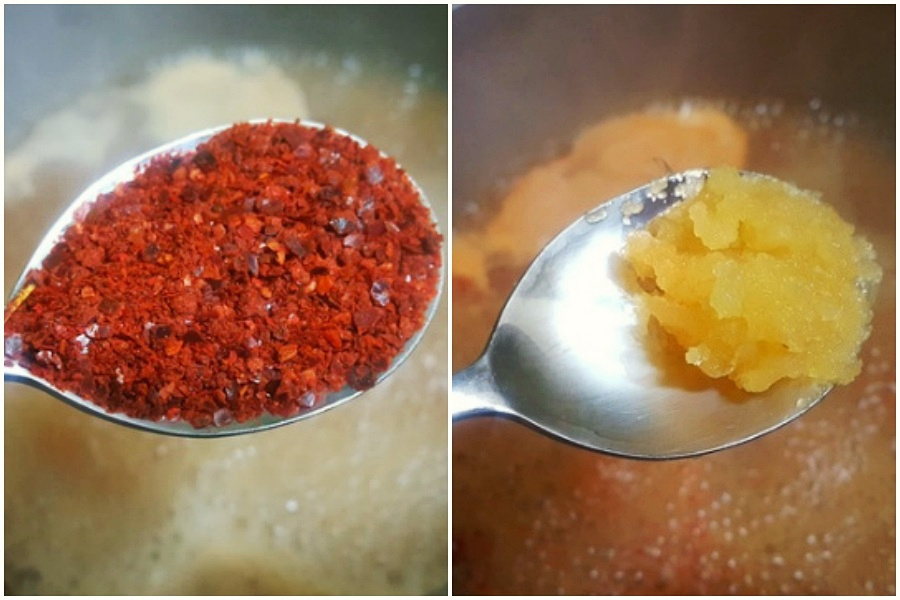 된장 2 스푼 (성인 숟가락), 고춧가루 1 스푼 (성인 숟가락), 마늘 1/2 스푼 (성인 숟가락)