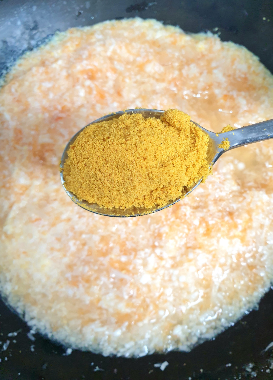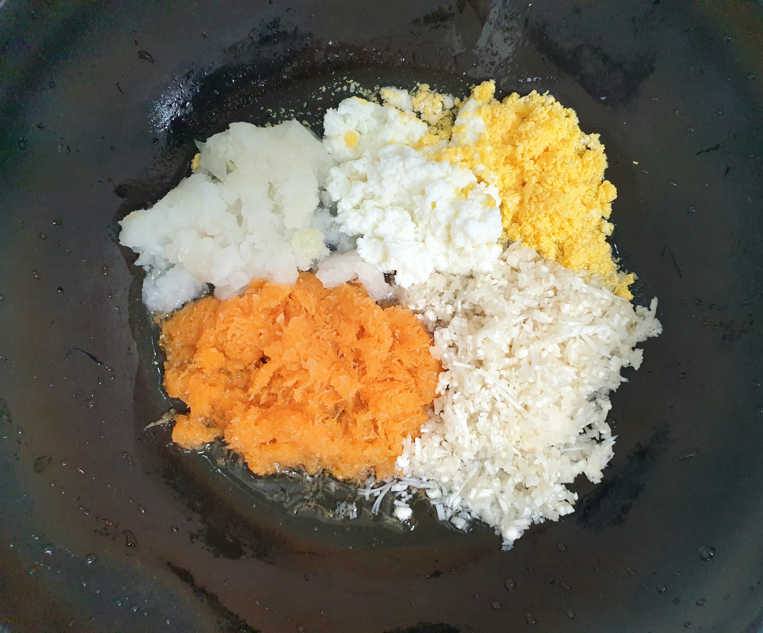 삶은 달걀 1 개 , 당근 90 g , 팽이버섯 50 g , 양파 1/3 개 , 물 300 ml , 카레 가루 3~4 큰술 , 연하퍼펙트 푸디 2 포