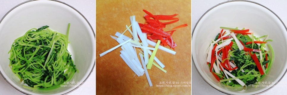 나물의 물기를 짠 후 볼에 담고 대파와 파프리카는 채 썰어 넣어줍니다