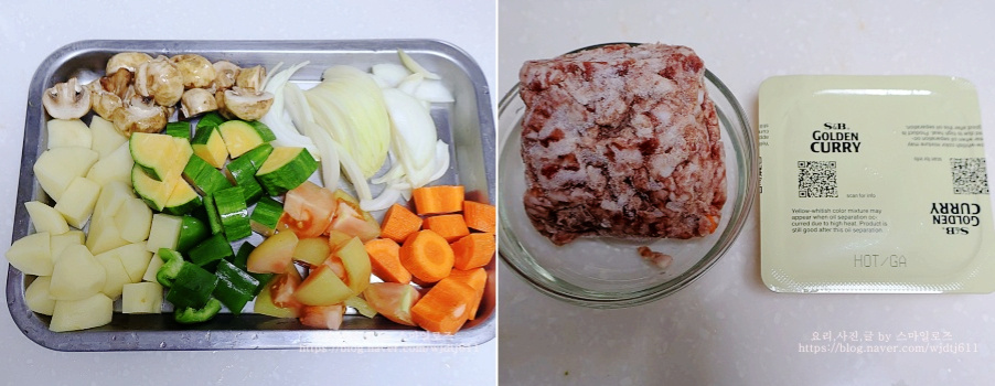 냉동실에 있는 소고기 다짐육과 고형 카레 매운맛으로 4조각 준비했어요