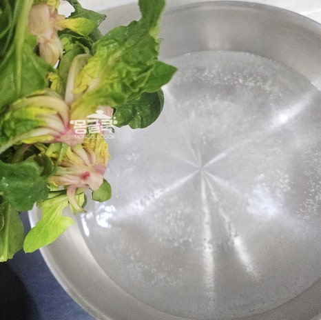 먼저 뿌리 부분부터 넣어 데치기 시작해 주세요.