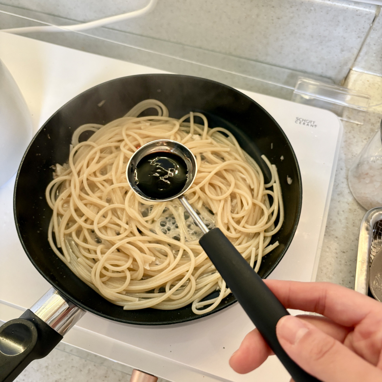 2. 간장을 팬 가장자리에 두러 살짝 태우듯 넣으면 중화풍 불향이 가미돼요.