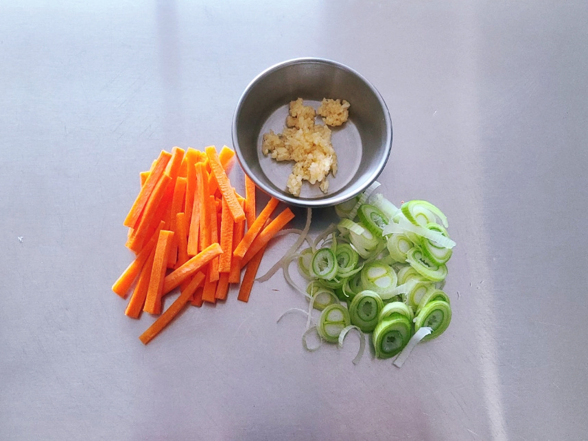 당근은 3mm 정도 두께로 채 썰고, 대파는 송송 썰고, 다진마늘 0.3큰술을 준비하면 되세요.