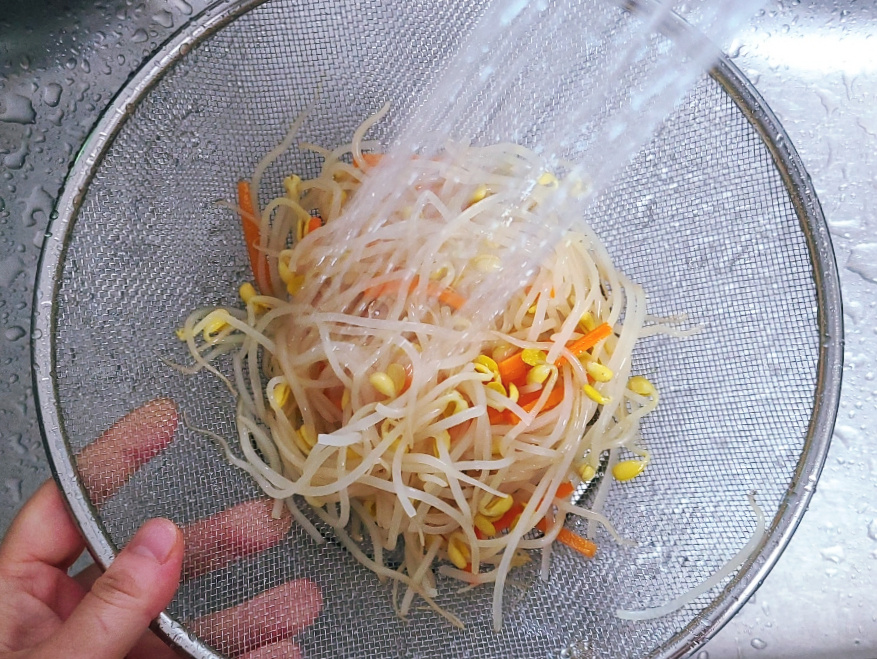 삶은 콩나물과 당근을 채반에 쏟아서 흐르는 차가운 물에 손으로 뒤적이면서 세척하고 물기를 탁탁 털어줍니다.