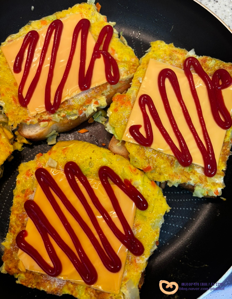 식빵 세 장을 각각 접어서 3개 분량으로 만들었더니 뚜아자매 간식용으로도 너무 좋더라고요. 아이들이 집어먹기에 편하고요, 칼로리 걱정 줄일 수 있답니다. 다이어트식으로 드실 분들은 저처럼 식빵 1장만 사용해서 만들어 보세요 :)