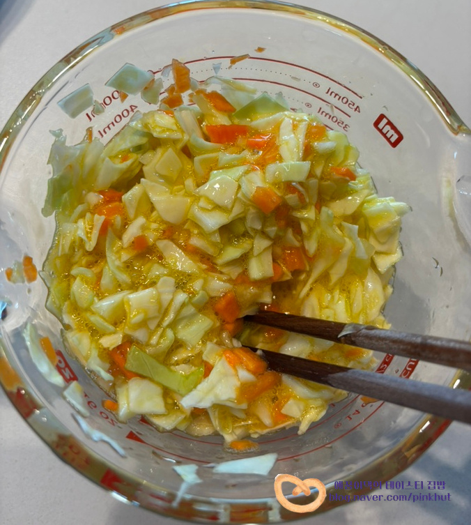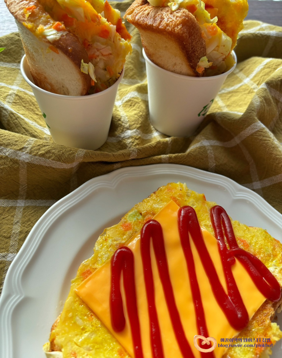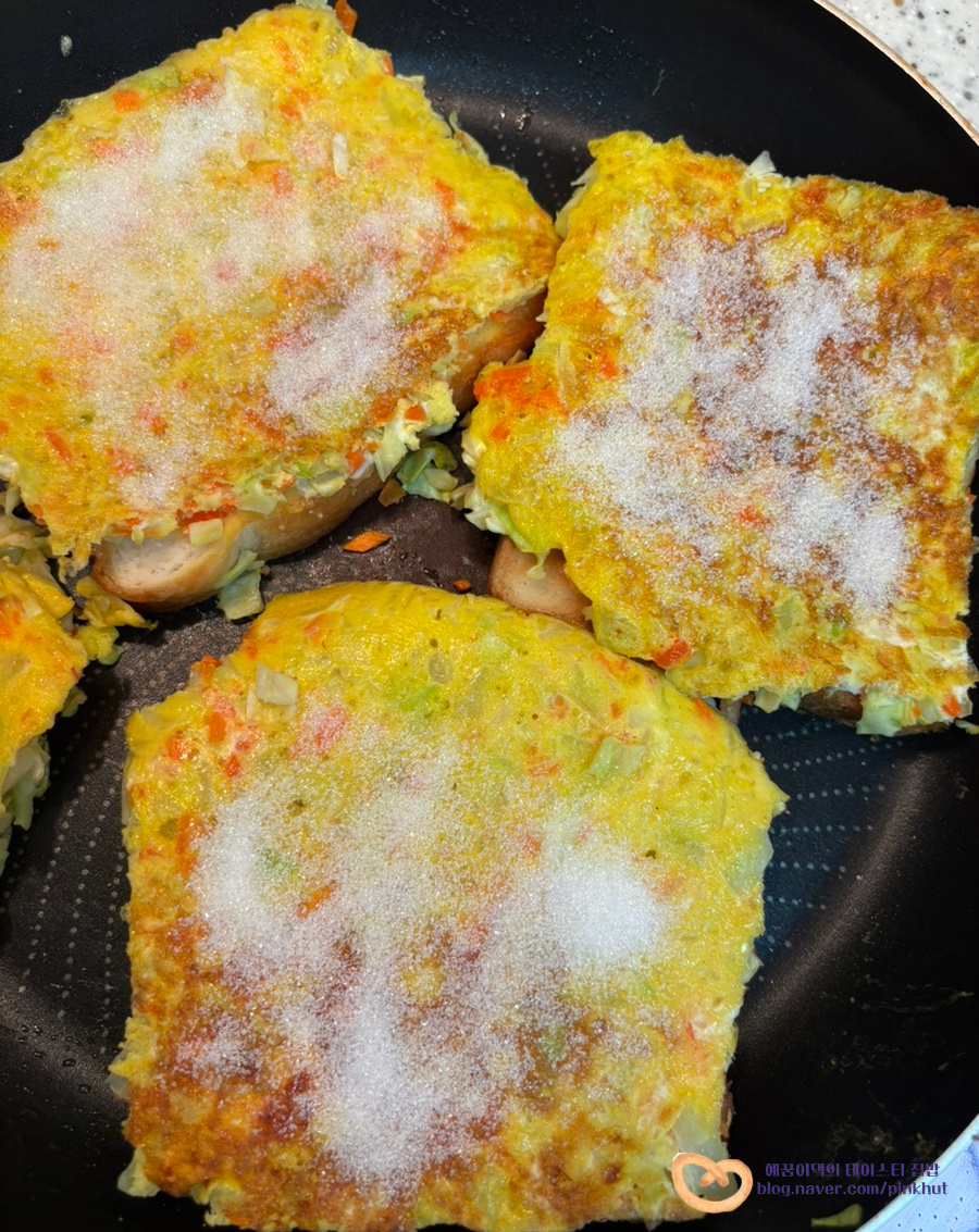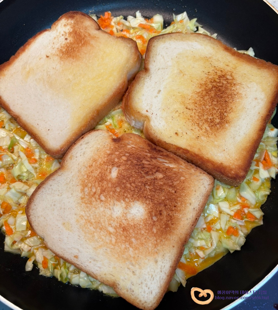마가린이나 버터 듬뿍 둘러 식빵을 굽고요, 빵 구웠던 팬 그대로 양배추 당근 달걀부침 부쳐주면 옛날토스트가 완성돼요.