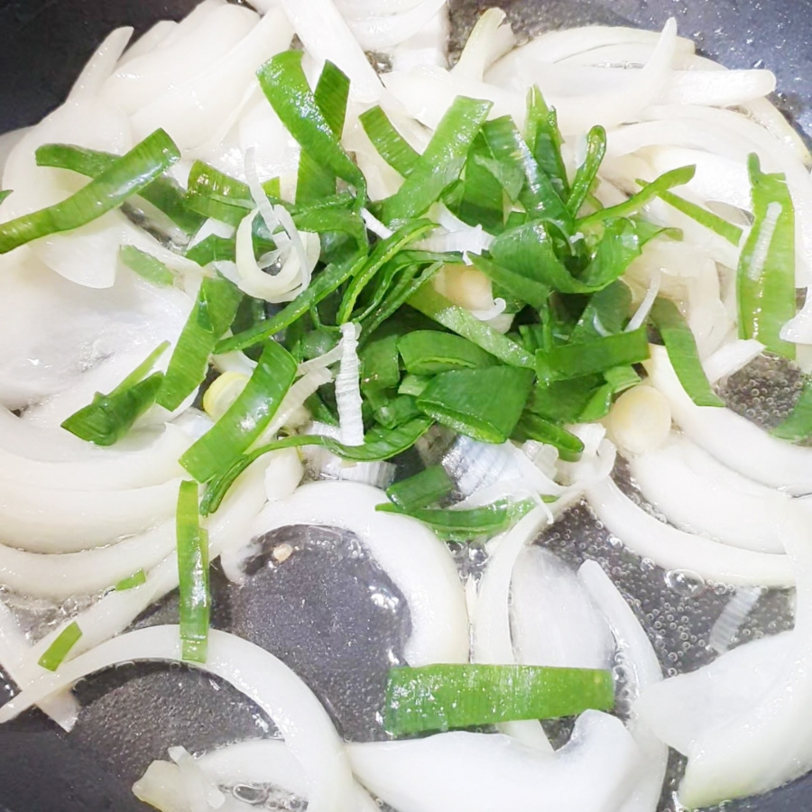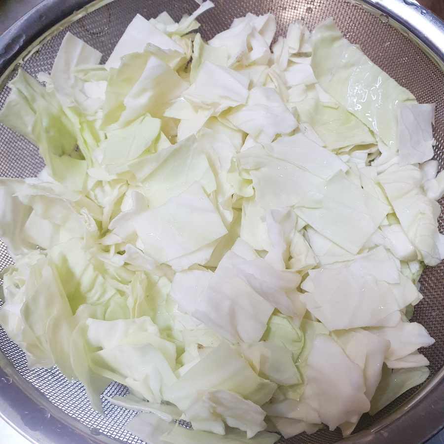 팬에 사용하는 기름 양을 줄이고 양배추와 양파, 깻잎을 넉넉하게 넣다 보니