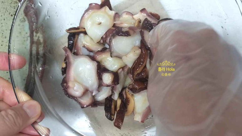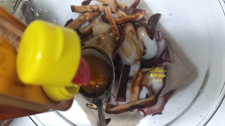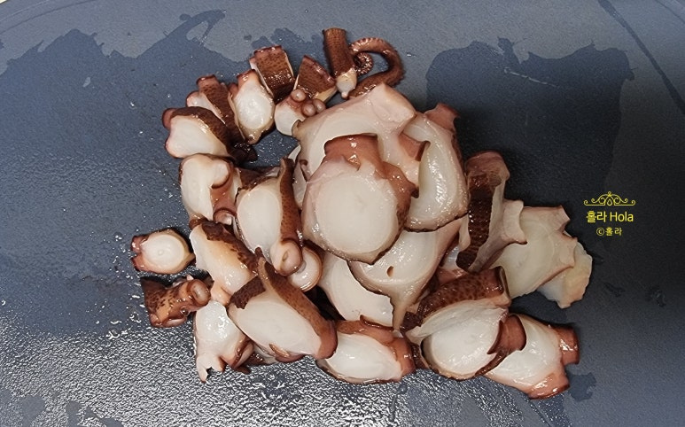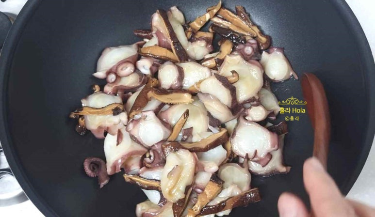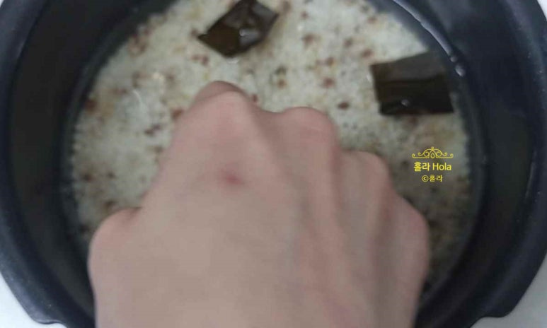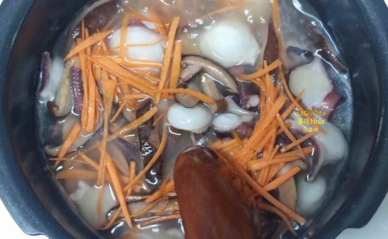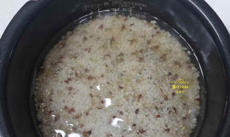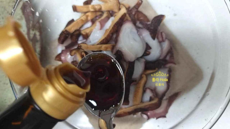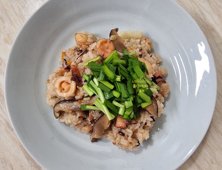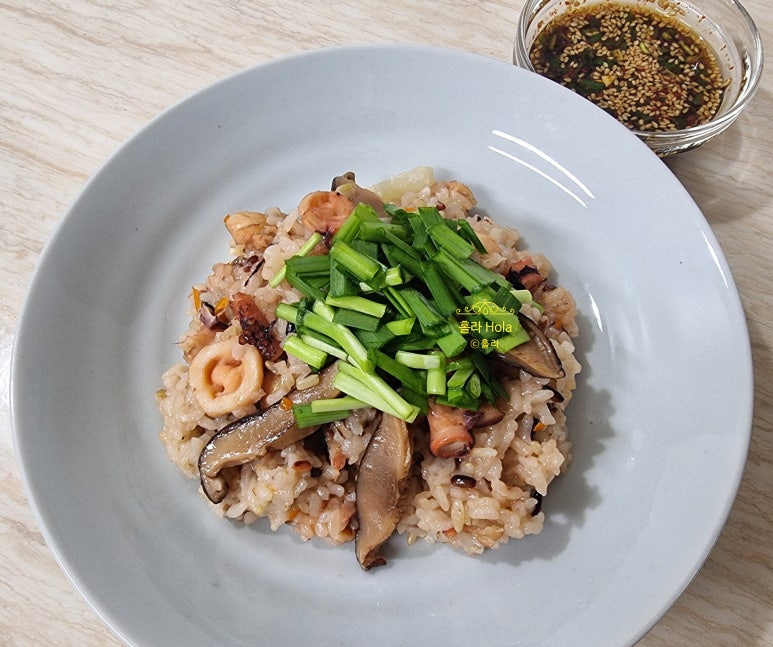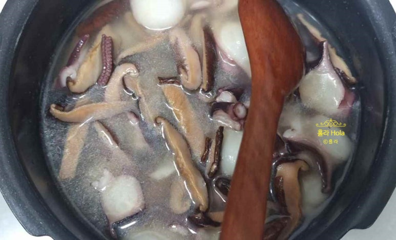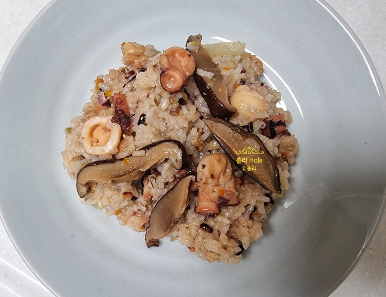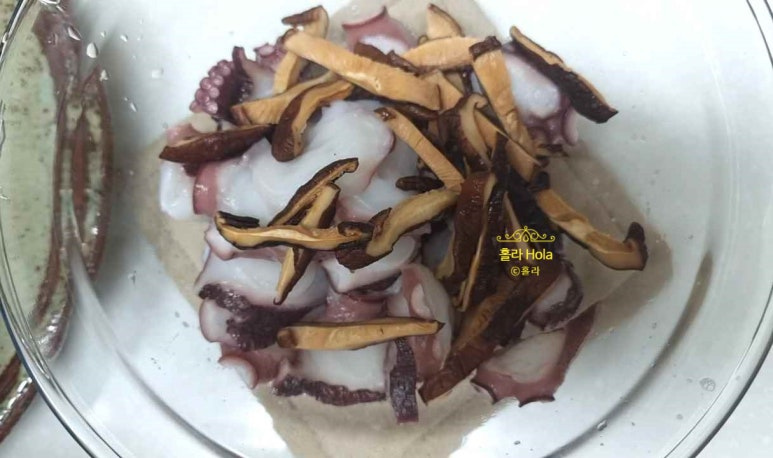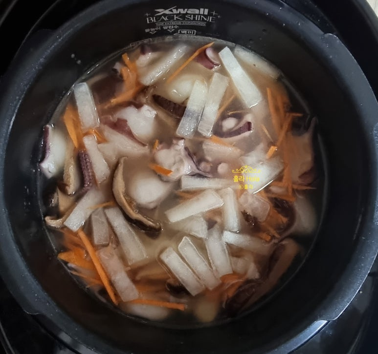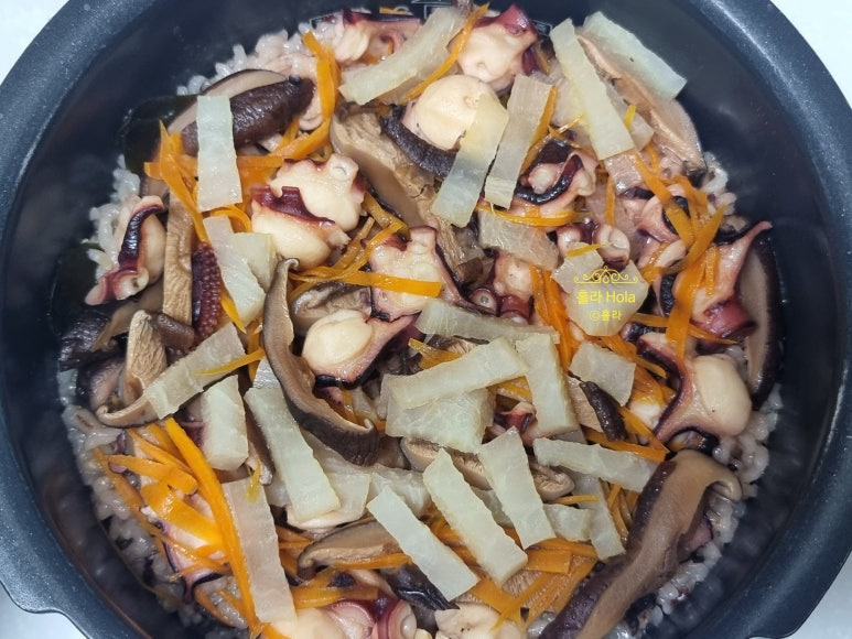 쌀 3 컵 (컵: 전기압력밥솥컵 기준), 잡곡 1 컵 , 물 4 컵 (버섯 우린 물 포함), 다시마 3 조각 (1g), 굵게 채썬 무 60 g , 자숙 문어 360 g , 채썬 당근 15 g , 청주 1 T , 건표고버섯 5 개 (물에 불렸다가 기둥을 제거하고 채썰어서 준비), 쯔유 2 T , 참기름 2 T , 송송썬 부추