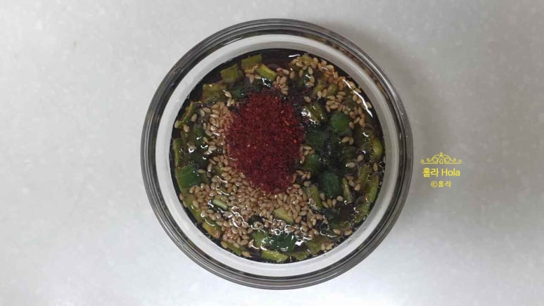 간장 4 T , 매실청 3 T , 식초 1 T , 참기름 2 t , 씨를 빼고 잘게 썬 청양고추 2 개 , 통깨 2 t , 고춧가루 2 t