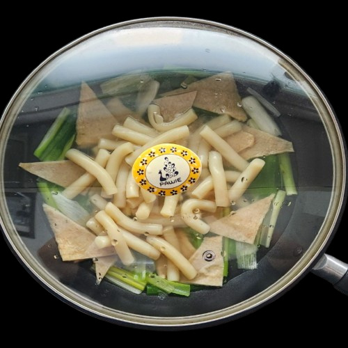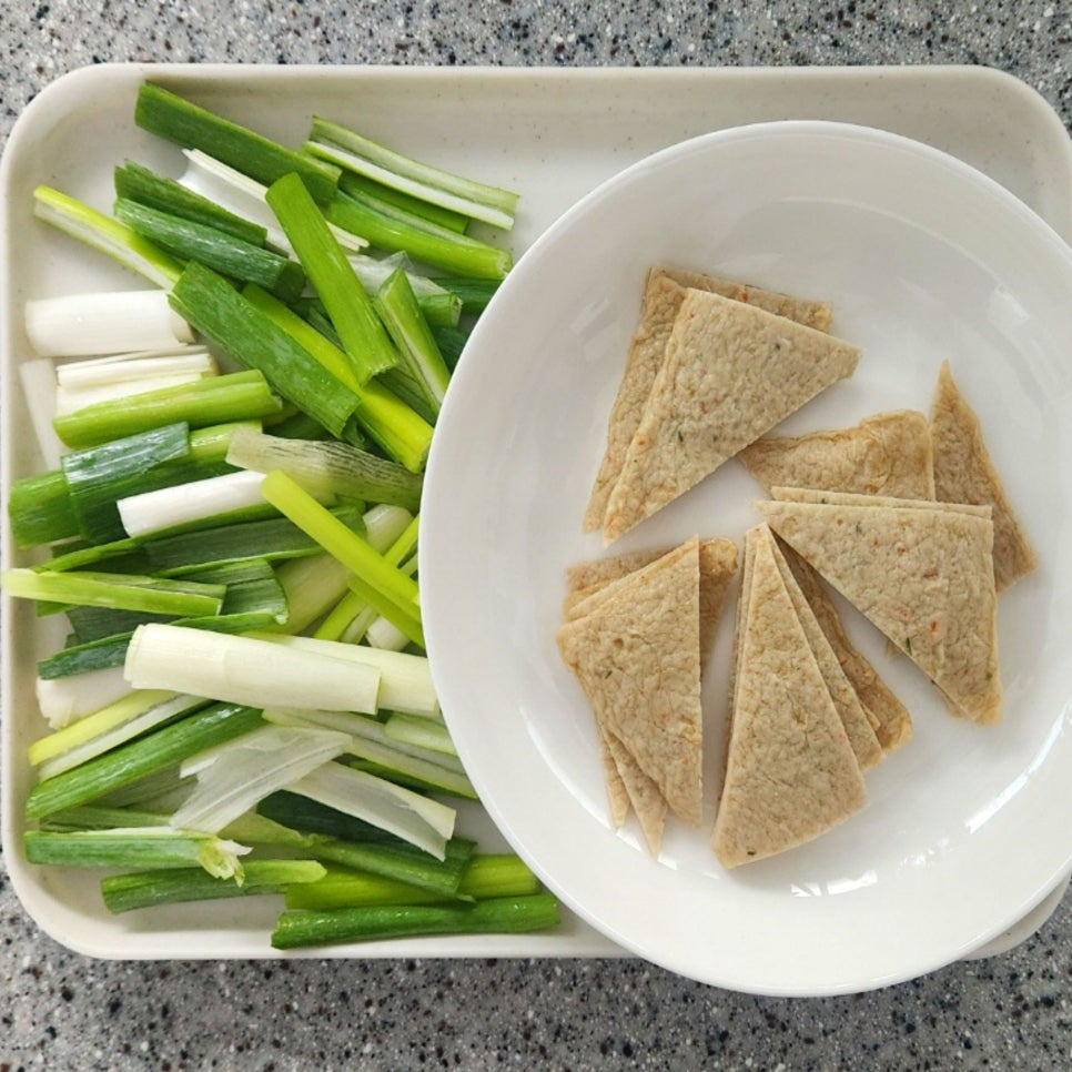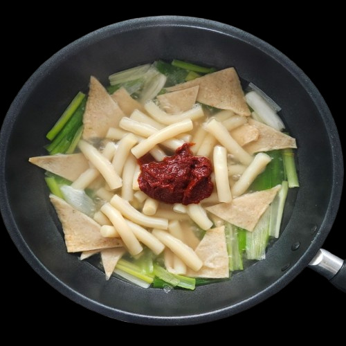 어묵 2 장 , 밀떡 250 g , 대파 많이 개 , 다진마늘 반 스푼 , 라면사리 1 개 , 물 500 ml , 설탕 1 스푼 , 소금 ⅓ 스푼