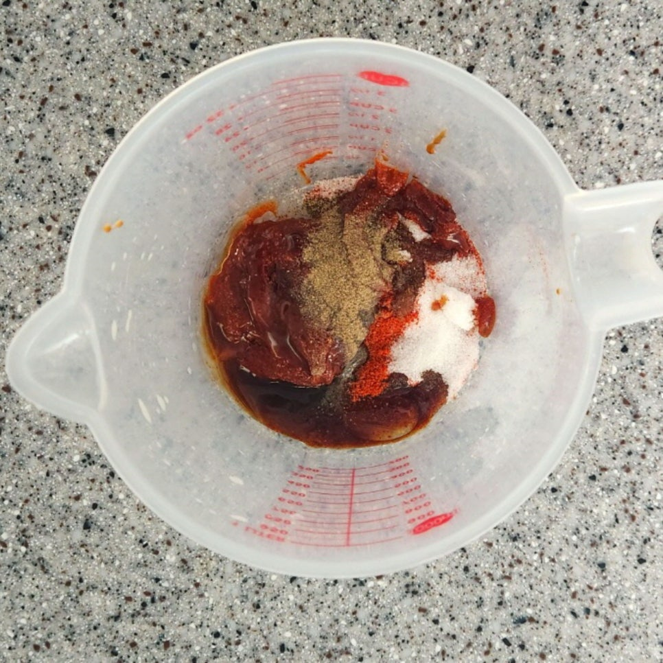고춧가루 2 스푼 , 설탕 1.5 스푼 , 고추장 1 스푼 , 간장 1 스푼 , 굴소스 1 스푼 , 식용유 반 스푼 , 후추 톡톡