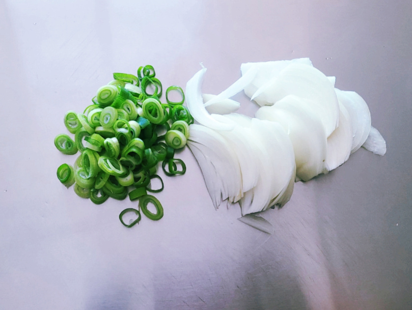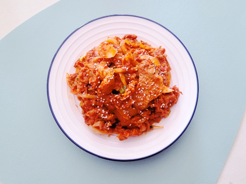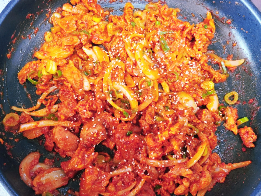 돼지고기 앞다리살 300 g , 대파 20 g , 양파 90 g (밥 숟가락계량), 돼지 불고기 양념: 고춧가루 1.8 큰술 (밥 숟가락계량), 설탕 0.5 큰술 (밥 숟가락계량), 생강가루 0.2 작은술 (밥 숟가락계량), 진간장 1 큰술 (밥 숟가락계량), 참치액 1 큰술 (밥 숟가락계량), 맛술 미림 2 큰술 (밥 숟가락계량), 알룰로스 2 큰술 (밥 숟가락계량), 고추장 2 큰술 (밥 숟가락계량), 다진 마늘 1 큰술 (밥 숟가락계량), 후춧가루 0.3 톡톡톡 , 물 50 ml , 식용유 약간 , 참기름 0.5 큰술 (밥 숟가락계량), 통깨 솔솔솔