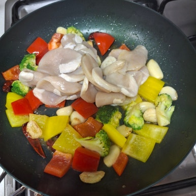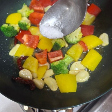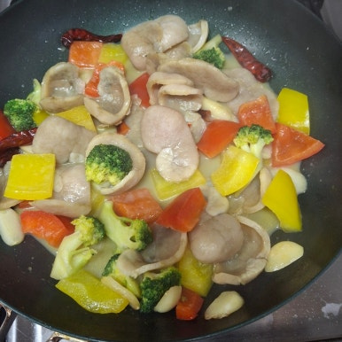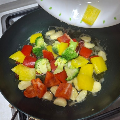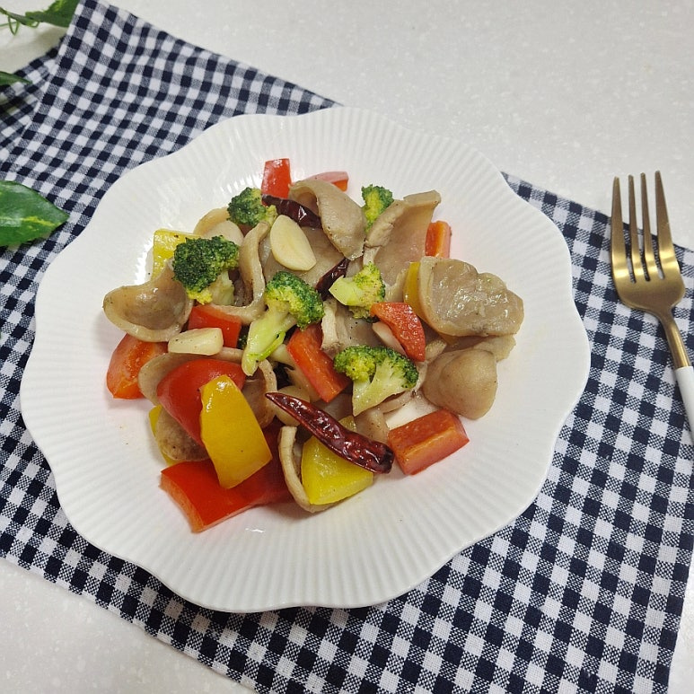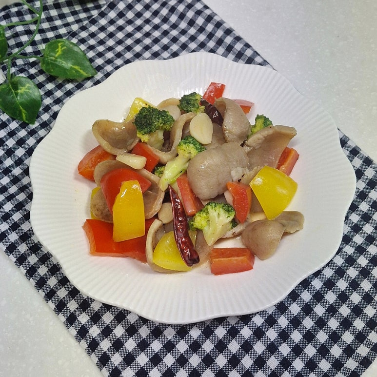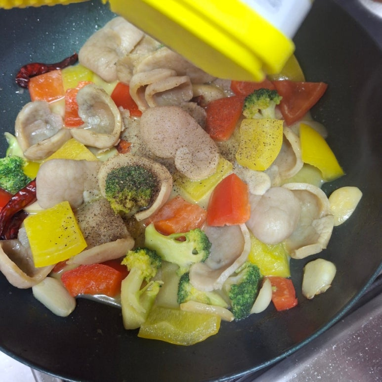 관자슬라이스 200g , 베트남고추 , 통마늘 5알 , 파프리카 , 브로콜리