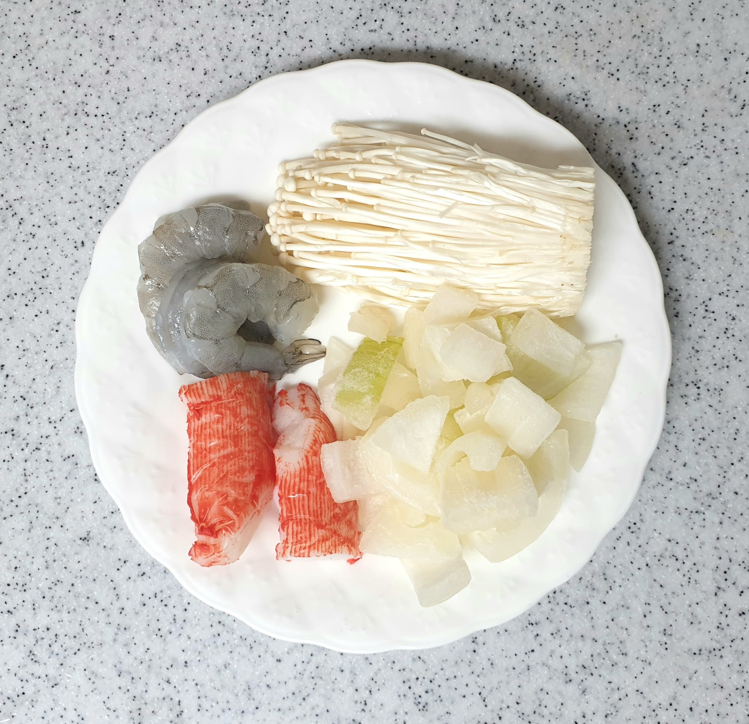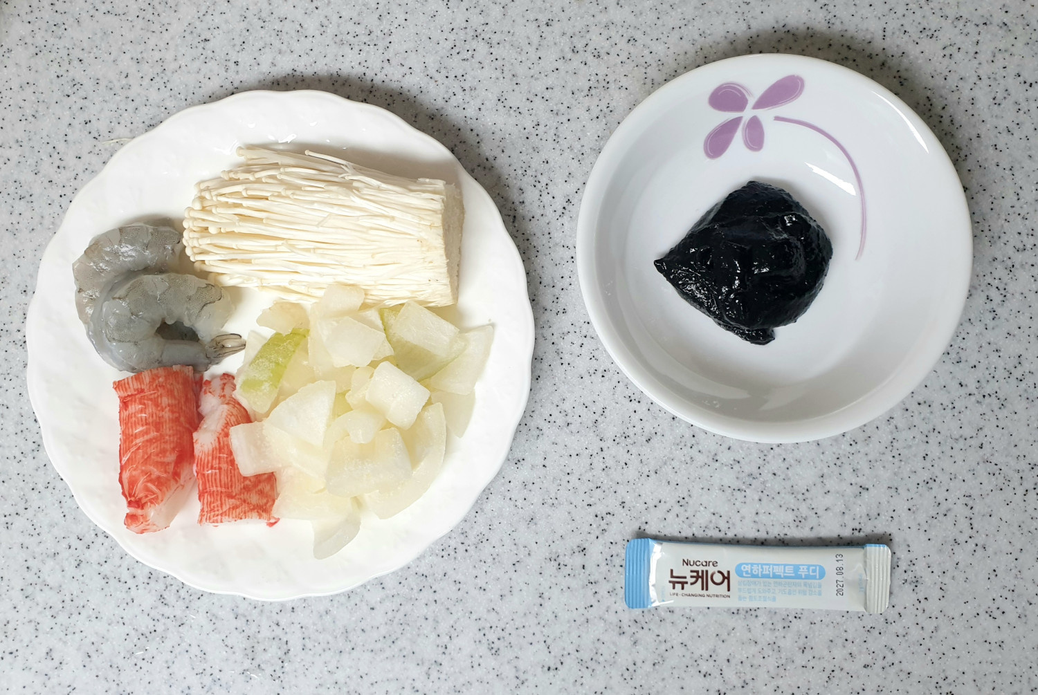 새우 40 g , 크래미 35 g , 팽이버섯 40 g , 양파 1/3 개 , 춘장 1.5 큰술 , 설탕 2/3 큰술 , 물 300 ml , 연하퍼펙트 푸디 1~2 포