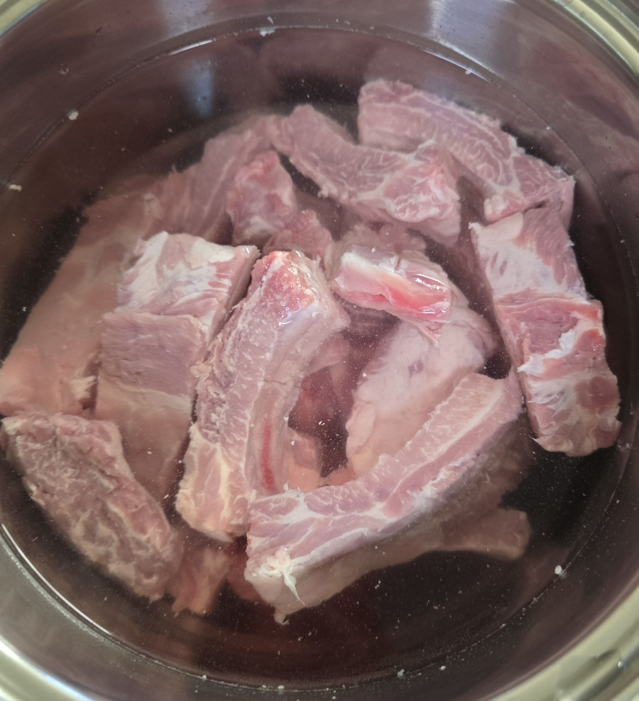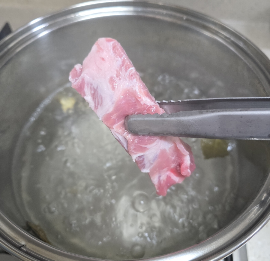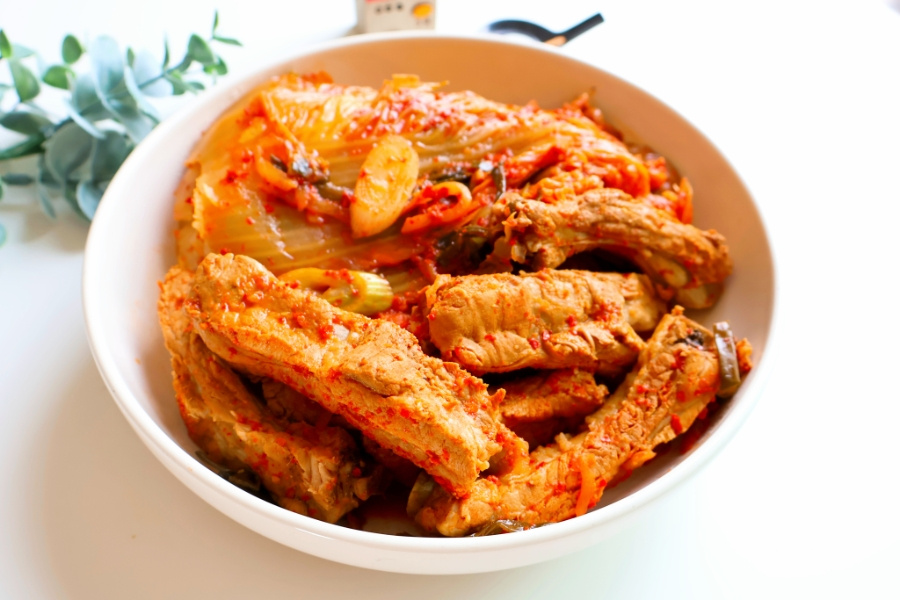 등갈비 1kg 김치 반포기 고기 잡내 제거 : 월계수잎 말린 생강 대파 1대 물 700ml , 양념 : 고춧가루 2 진간장 2 참치 액 1 다진 마늘 2 맛술 2 설탕 1.5 생강가루 약간 통후추 20바퀴 , 계량 : 밥숟가락