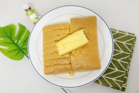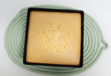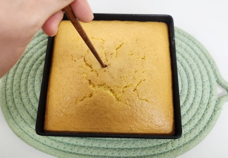 30분 뒤에 잘 구워진 오븐 카스테라를 꺼내서 젓가락으로 한번 찔러 봤어요. 이때 젓가락에 묻어 나오는 게 없으면 카스테라가 잘 익은 거예요. 그리고 살짝 식혀 줍니다.