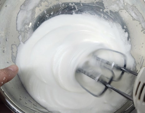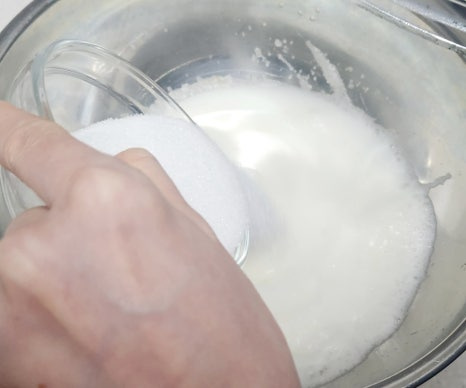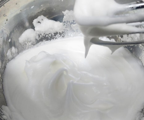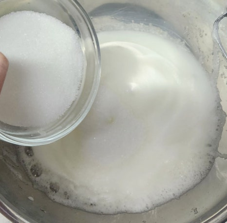 거품이 어느 정도 올라오면 설탕 70g을 3번에 나눠 넣으면서 계속 휘핑해주세요. 처음엔 설탕 1/3, 중간에 또 1/3, 마지막엔 남은 설탕 전부 넣고 휘핑해 주면 됩니다. 머랭은 단단한 뿔이 살짝 휘는 정도까지 올리는 게 포인트예요. 너무 세게 치면 구웠을 때 딱딱해질 수 있으니 주의해요.