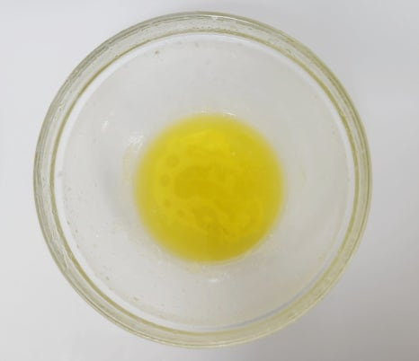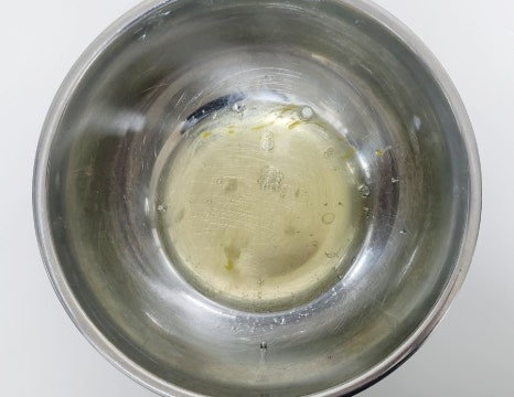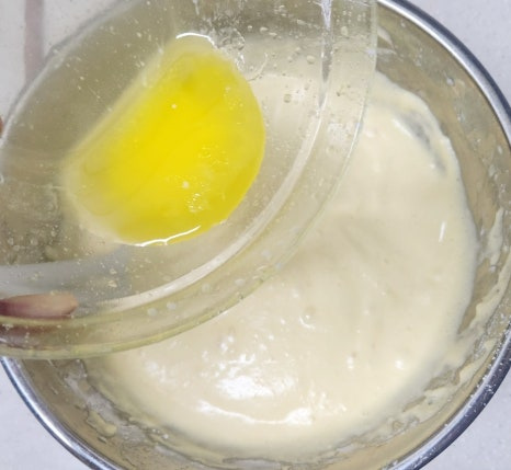 버터 30g을 전자레인지에 20~30초 정도 돌려 녹인 뒤 살짝 식혀서 반죽에 넣어주세요. 그리고 이때도 주걱으로 가볍게 섞어주세요.