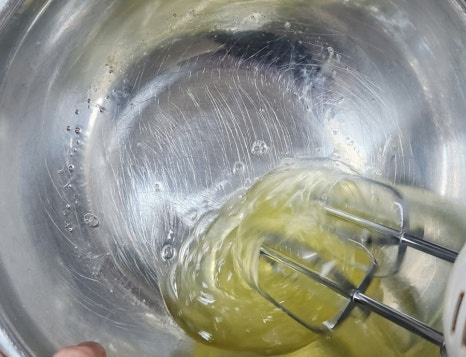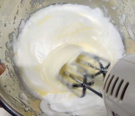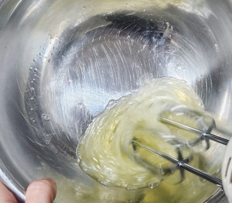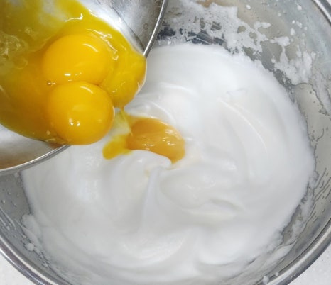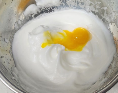 머랭이 완성되면 계란 노른자를 2개씩 나눠 넣으며 휘핑해주세요. 노른자가 들어가면 머랭이 살짝 부드러워지는데 그게 정상이에요. 색깔이 예쁜 연한 노란색이 되면 잘 섞인 거예요.