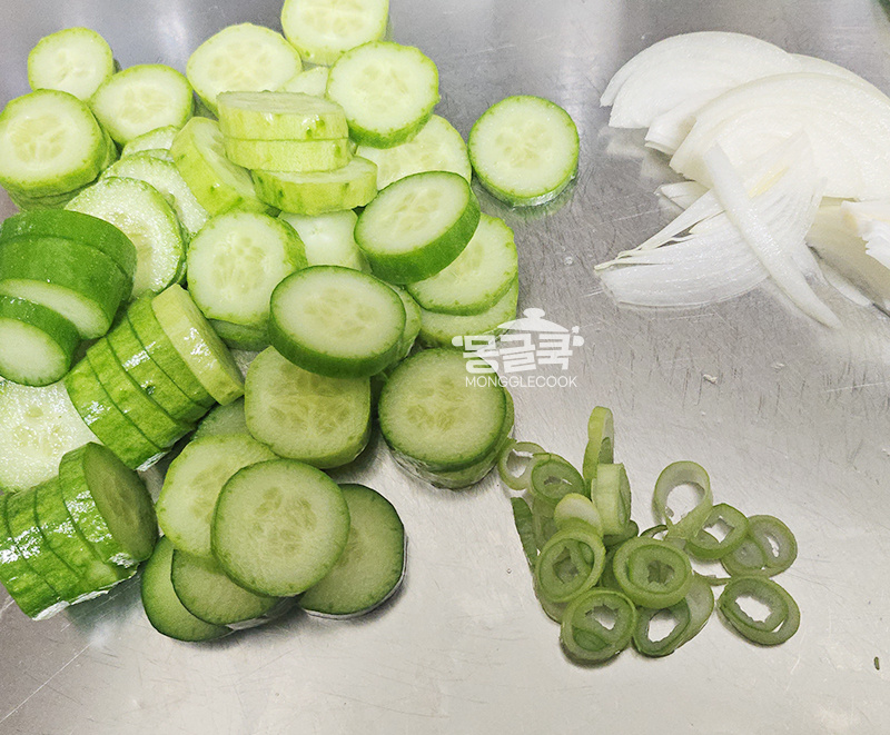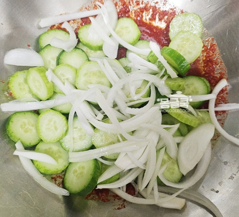 준비한 오이와 양파, 대파를 만들어둔 양념장에 넣어주세요.