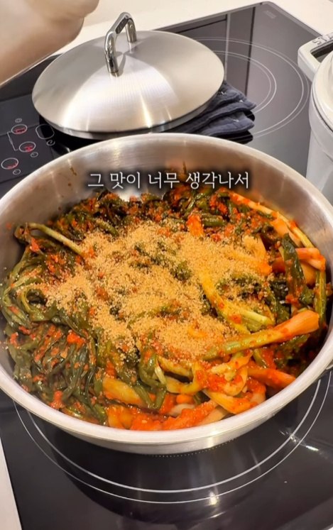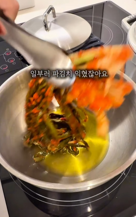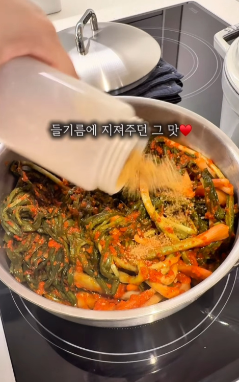 파김치 적당량 , 들기름 적당량 (기호에 맞게), 김치 1~2 인분 (종류 상관없이 자유롭게 선택), 비정제 원당 1 꼬집 , 들깨가루 적당량