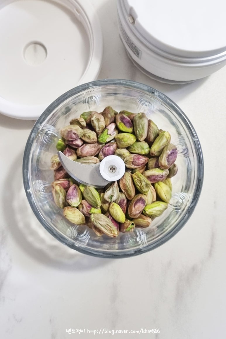전동 초퍼에 피스타치오를 갈아주는데 입자가 너무 고운것 보다는 피스타치오 씹히는 식감이 있으면 더 맛있으니까