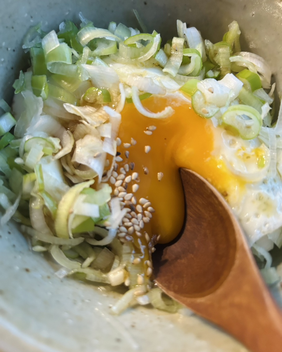 밥에 생대파를 잔뜩 썰어 올리고 참기름과 계란 노른자를 올려 줬는데 대파 한가지로 간단하게 만든 덮밥인데도 너무 맛있더라구요.