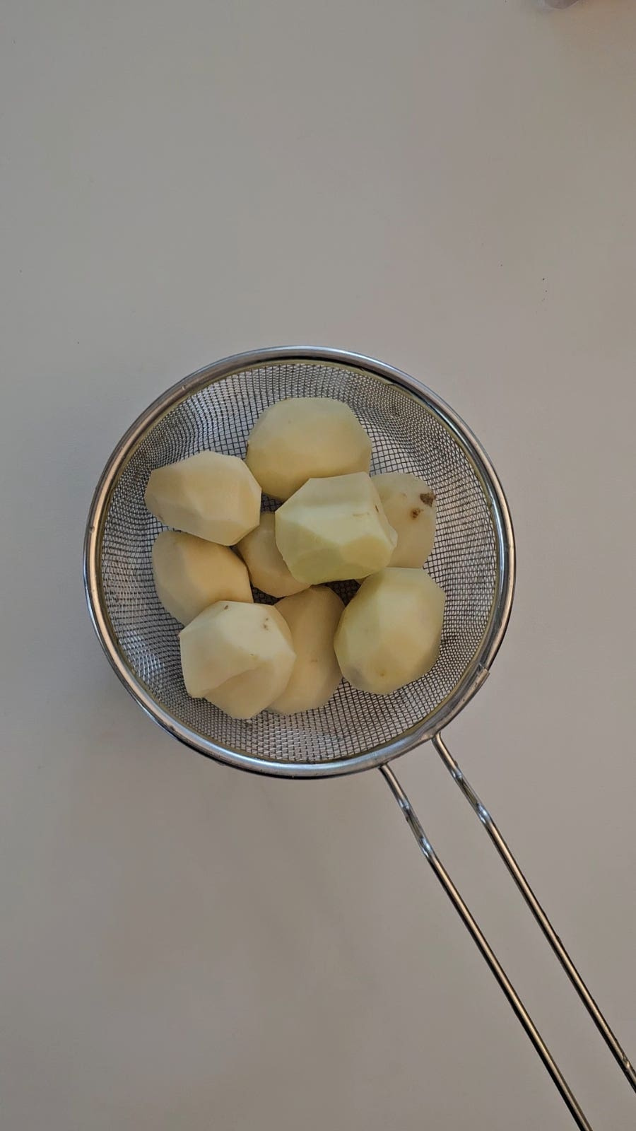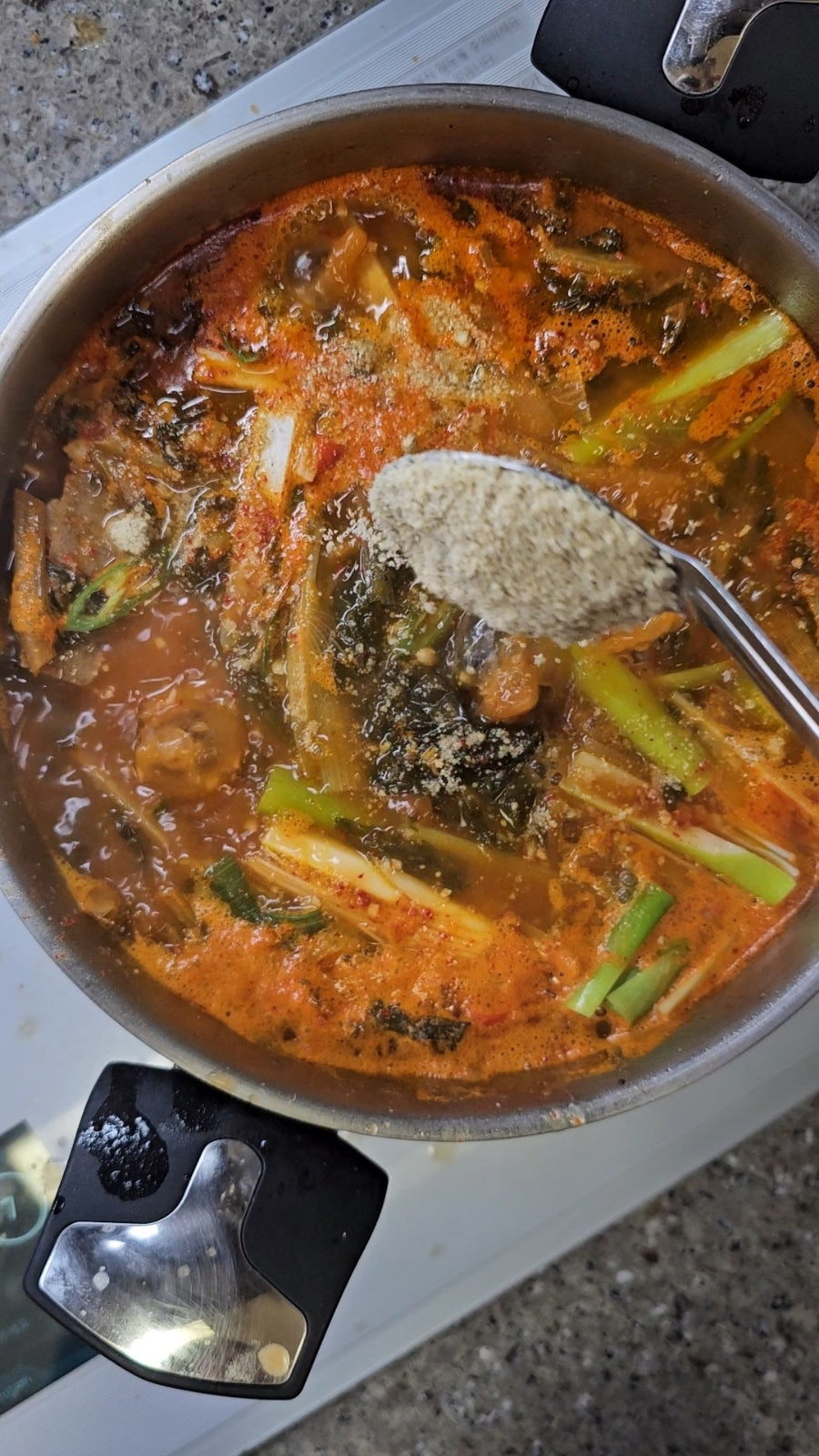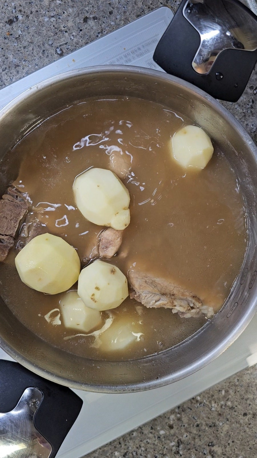 삶은 돼지등뼈는 건져내고 육수 건더기는 체에 걸러준 후 냄비에 다시 붓고 삶은 돼지등뼈와 감자를 넣은 다음 10분간 강불에서 끓여주세요.
