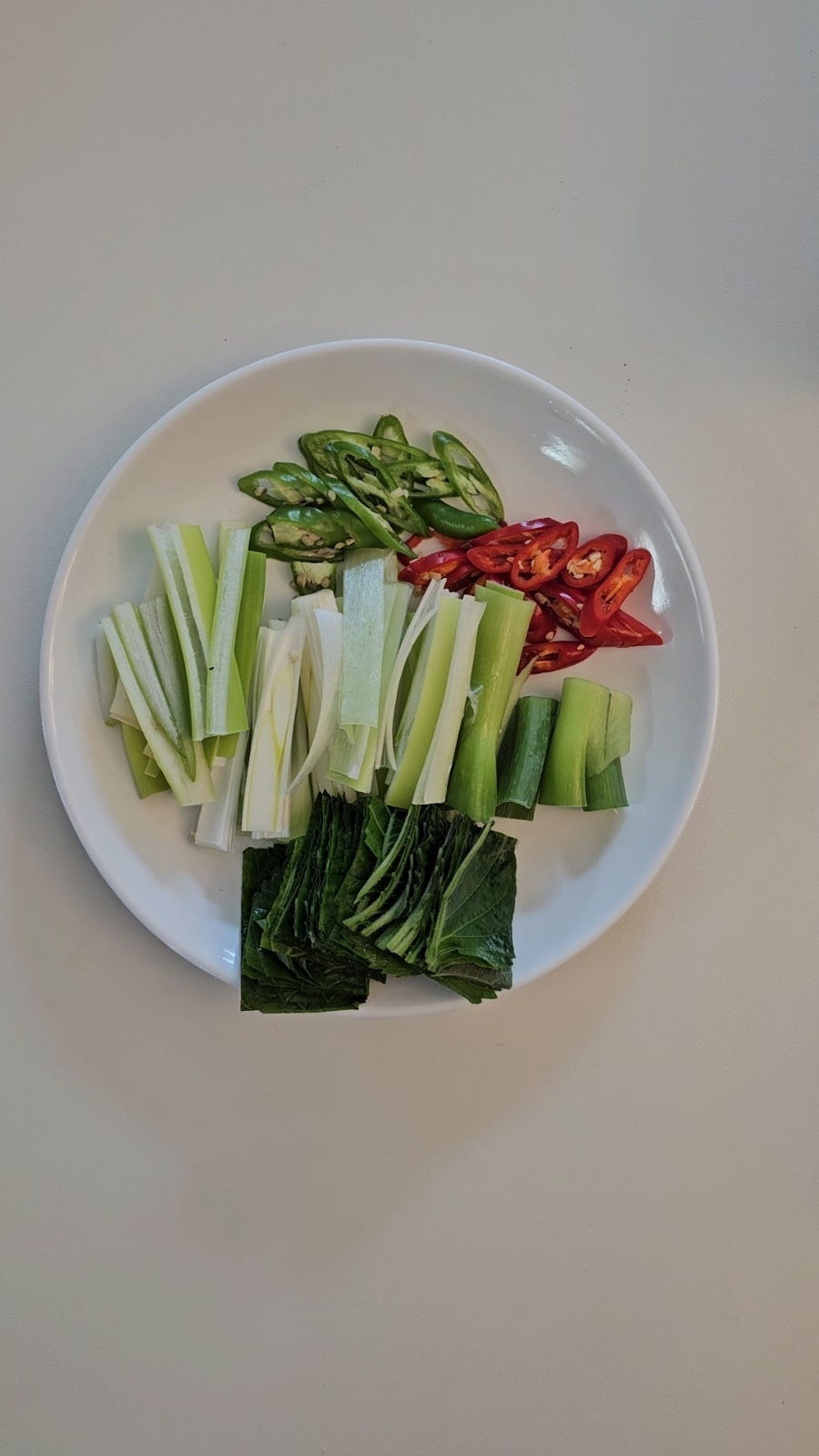 청양고추와 홍고추는 3cm 길이로 어슷썰기 해주세요.