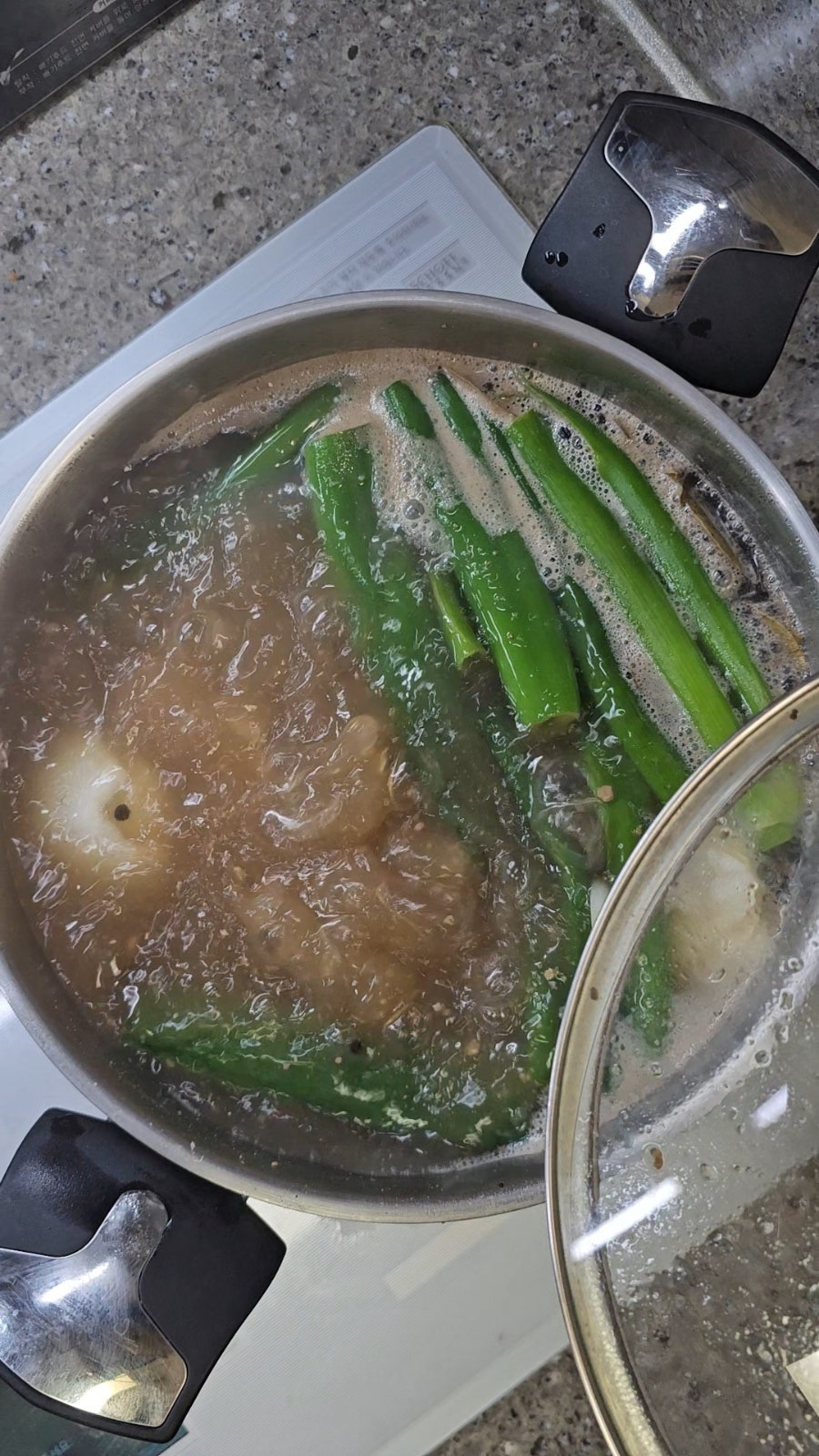 물이 끓어오르면 강불에서 뚜껑을 열고 10분간 더 끓인 후 뚜껑을 닫고 중약 불로 낮추어 뼈에 붙은 고기가 분리될 때까지 1시간 ~ 1시간 30분 더 끓여주세요.