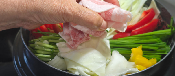 삼겹살은 맛있지만 기름기가 부담스러울 때가 많습니다. 이럴 때는 **기름 없이 찌는 ‘대패삼겹살 채소찜’**이 딱이에요. 채소의 수분으로 쪄내 담백하고, 참소스 하나면 별다른 양념 없이도 충분히 맛있는 한 끼가 됩니다.