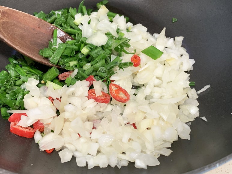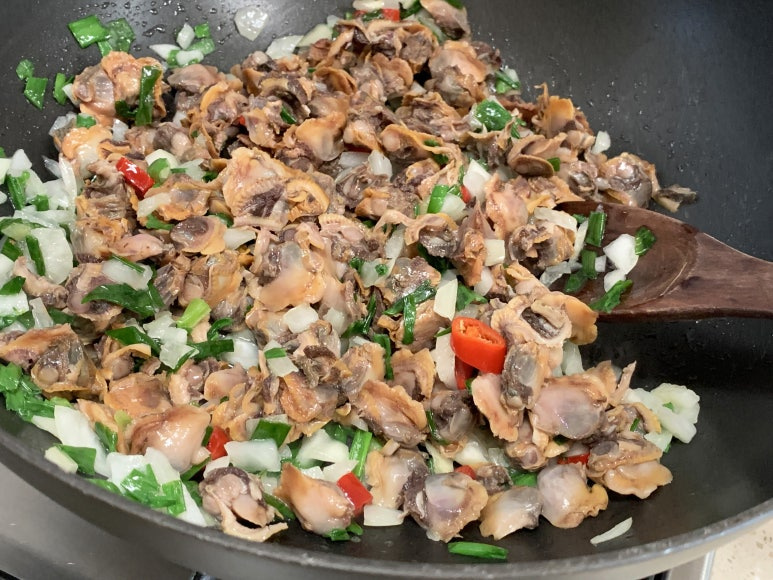 한꺼번에 꼬막과 양파, 파를 볶아 준 후,