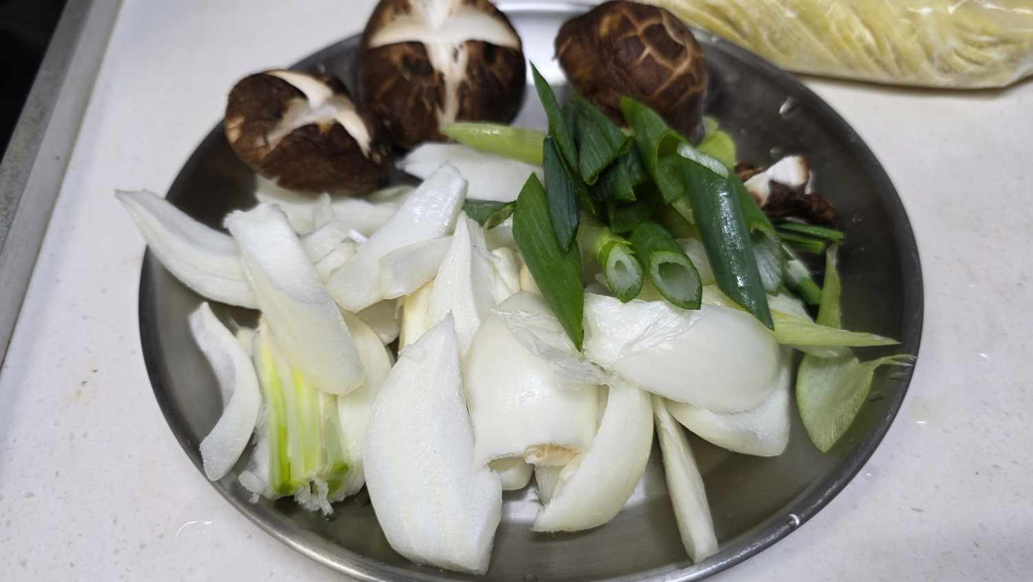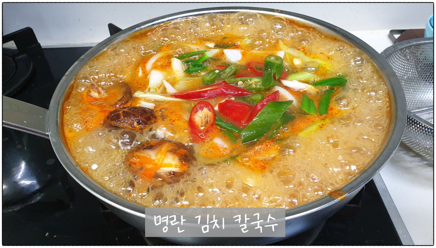 명란 100 g , 칼국수면 3 인분 , 물 1.8 L , 양파 반개 , 대파 1/2 대 , 다진마늘 1 큰술 , 국간장 3 큰술 , 청양고추 1 개 , 홍고추 1 개 , 까나리액젓 1 큰술 , 멸치액젓 1 큰술 , 다시마 1 장 (손바닥크기), 다시멸치 반줌 , 표고버섯 3 개 (중), 신김치 한컵 (작게썰은김치)