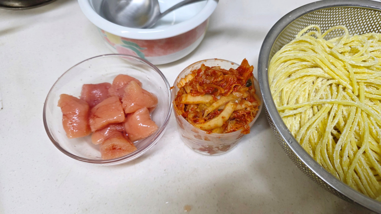 면에 묻은 밀가루는 최대한 털고 넣어야해요. 그냥 넣으면 텁텁하고 걸죽해집니다.