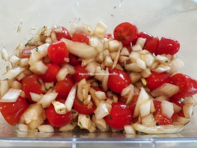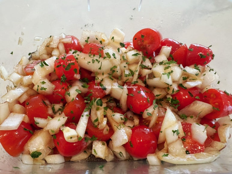 양파 1/2개 , 아보카도 오일 3큰술 , 발사믹 식초 3큰술 , 메이플 시럽 2큰술 , 소금 조금 , 레몬즙 1/2개 , 화이트 발사믹 3큰술 , 방울 토마토(소) 1상자 , 파슬리 가루 적당히