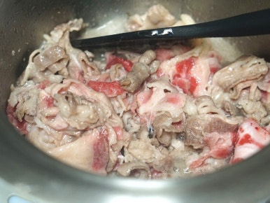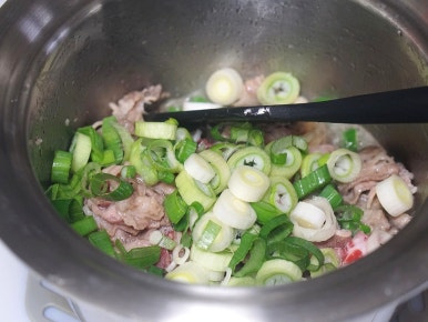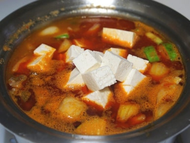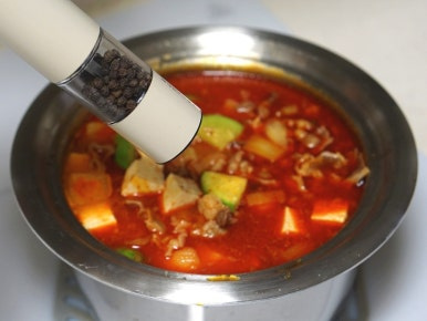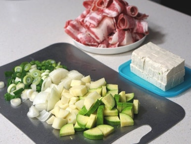 우삼겹 300g , 감자 2개 , 애호박 1/2개 , 양파 1/2개 , 대파 1/2대 , 두부 250g , 고추장 3큰술 , 고춧가루 1큰술 , 다진마늘 1큰술 , 물 700ml , 코인육수 2알 , 후추 조금