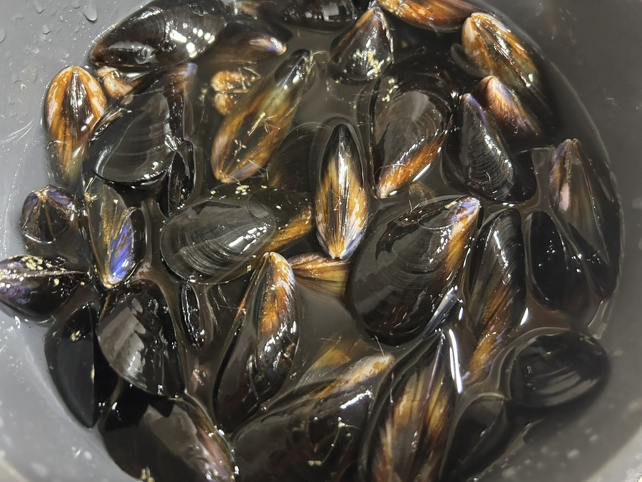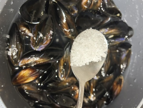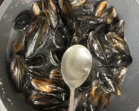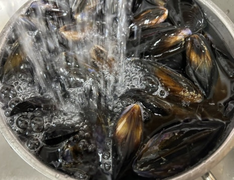 홍합 손질은 홍합 껍질을 깨끗이 씻고 홍합 중간에 붙어있는 족사를 떼어내요.