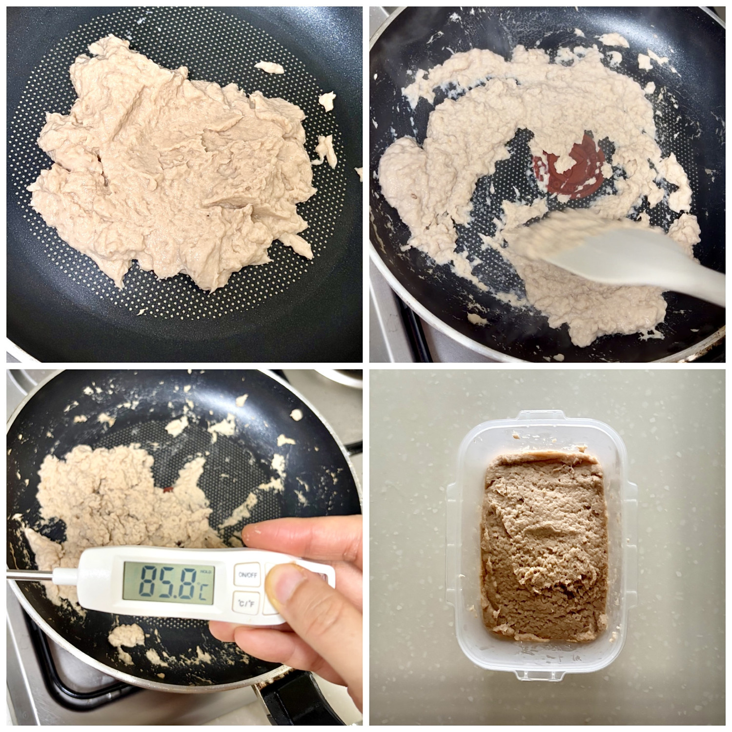 팬에 간 연어살을 넣고 온도가 85도 이상 될 때까지 저어준 후 네모난 용기에 담고 냉장고에서 굳혀주세요