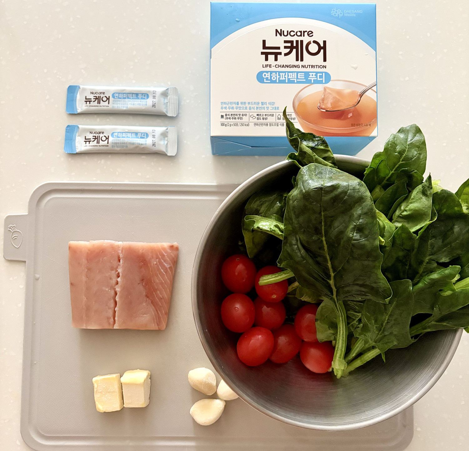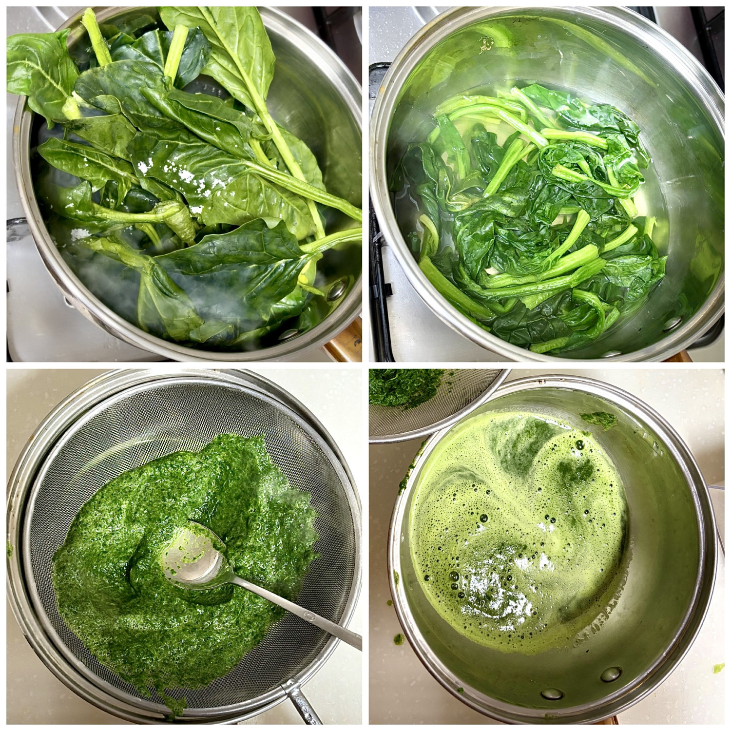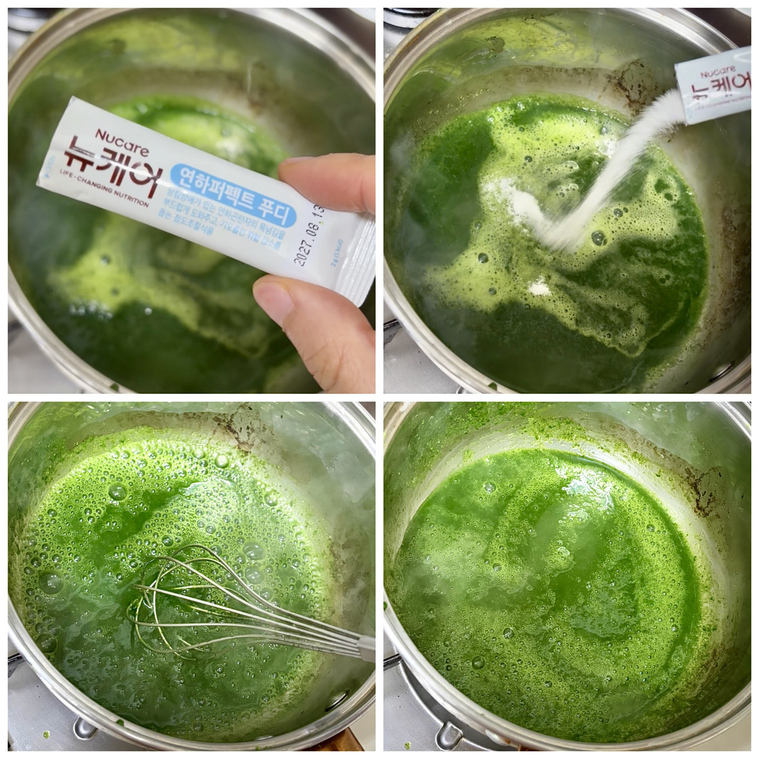 - 냄비에 시금치 물을 넣어 끓이고 온도가 85도 이상 올라오면 연하퍼펙트 푸디 1g을 넣고 잘 저어주세요.