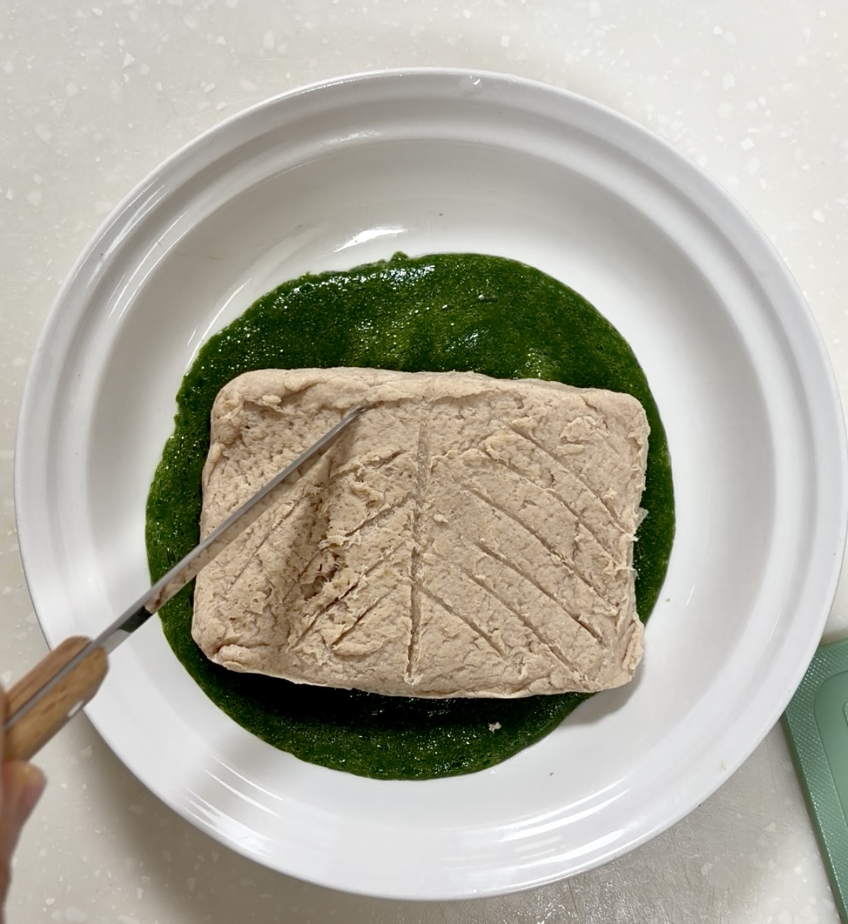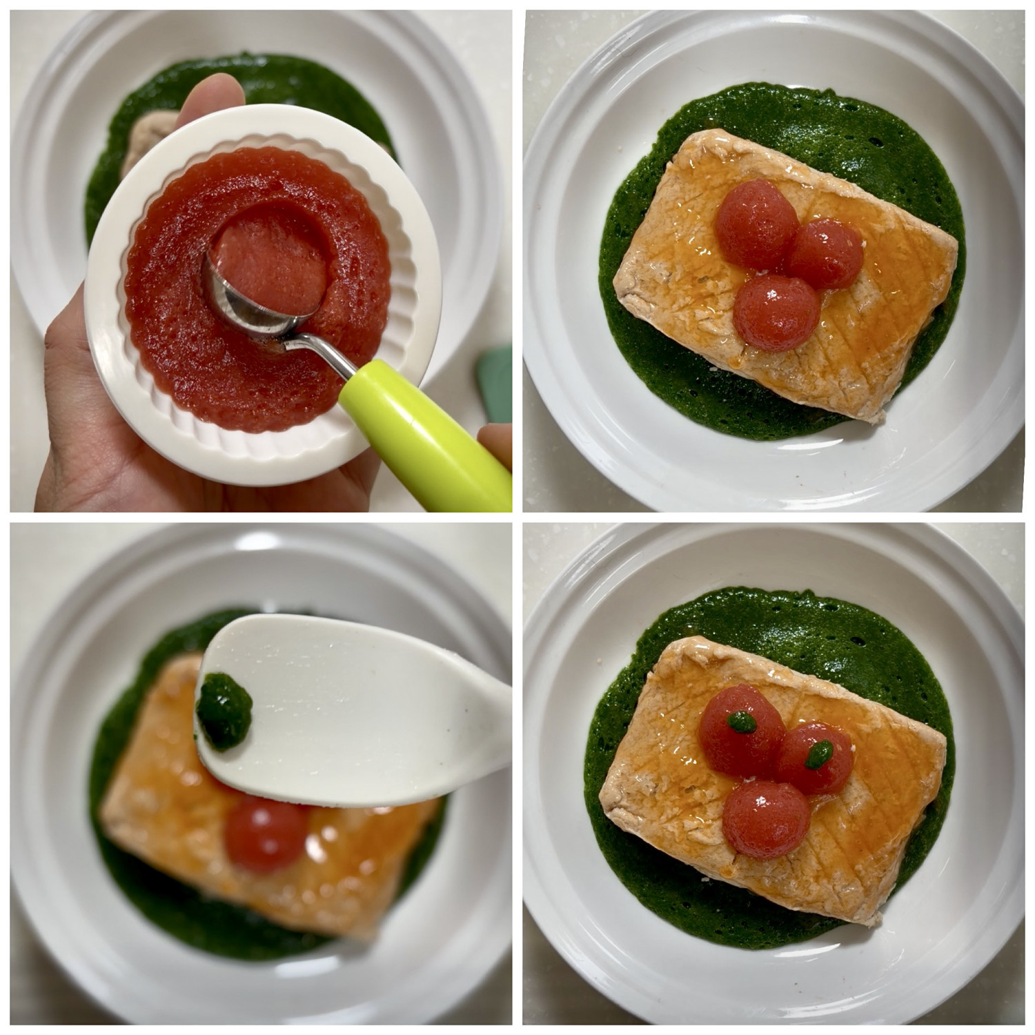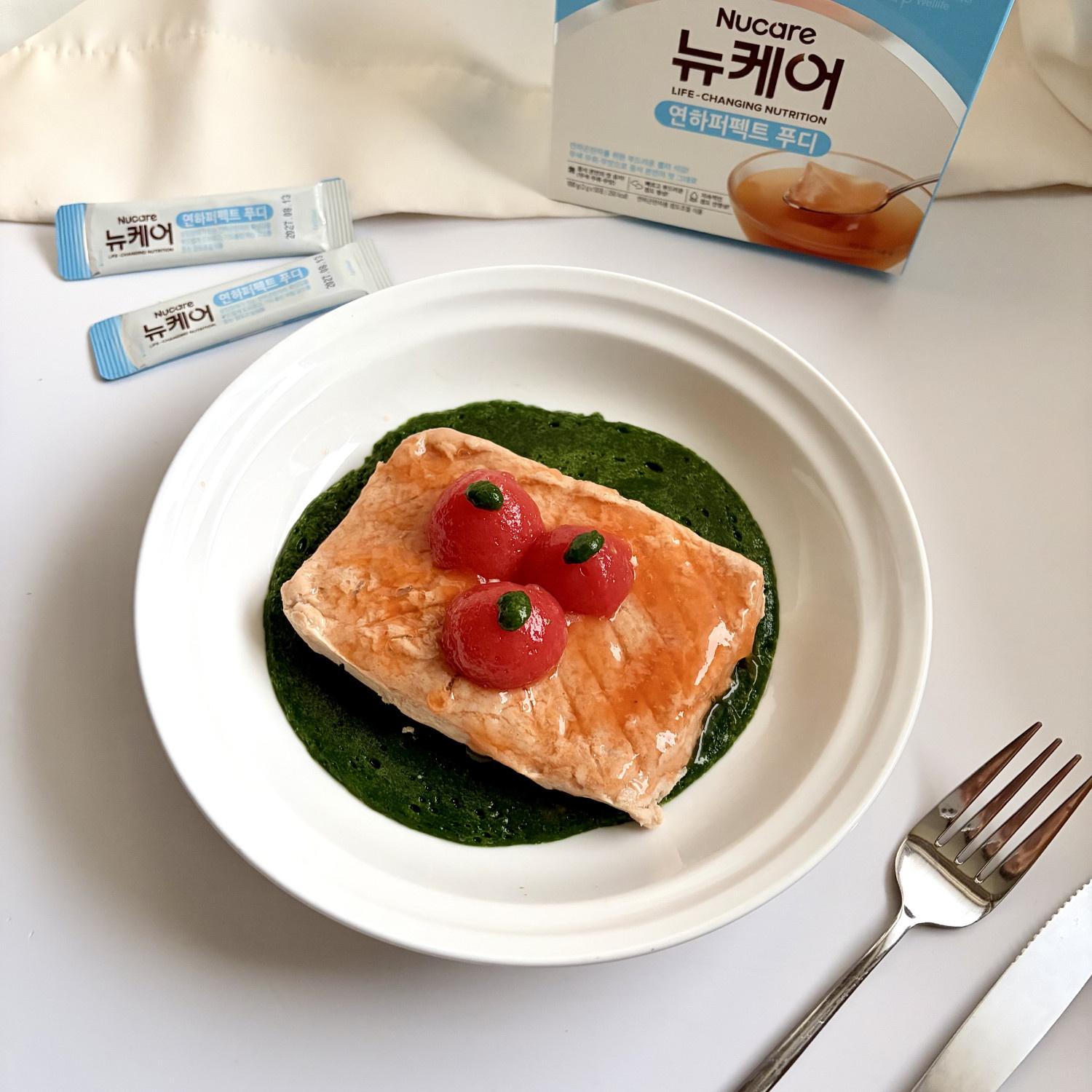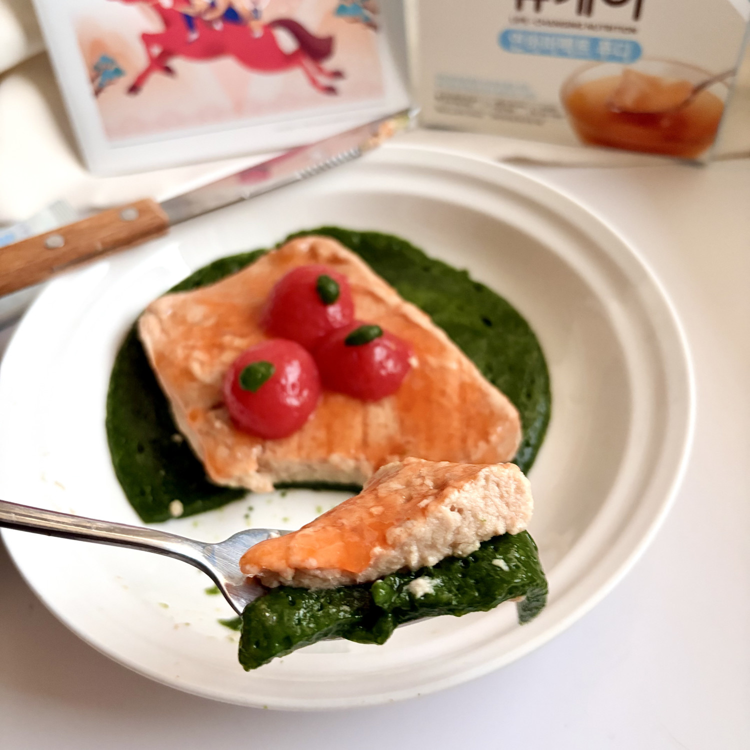 - 시금치 위에 연어스테이크 살을 올려주고, 칼을 이용해 연어의 무늬를 만들어주세요