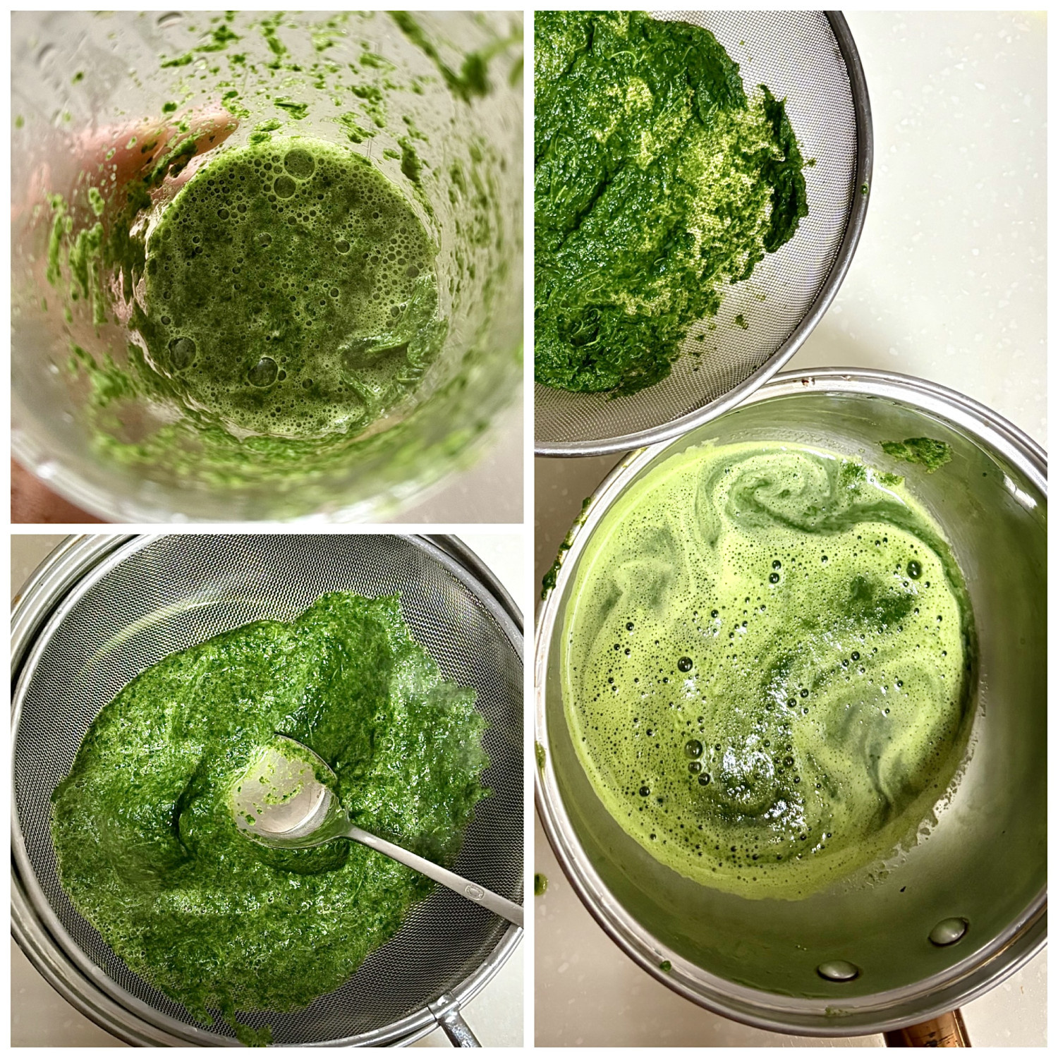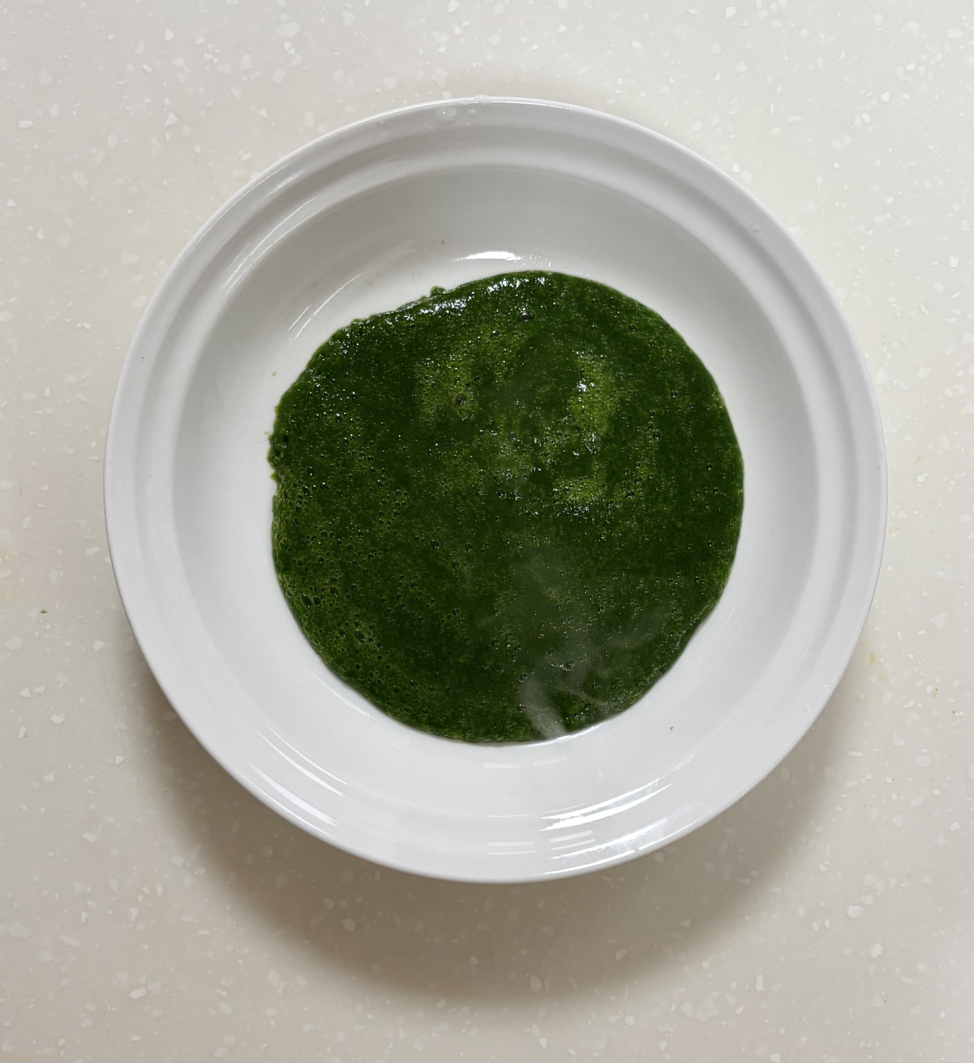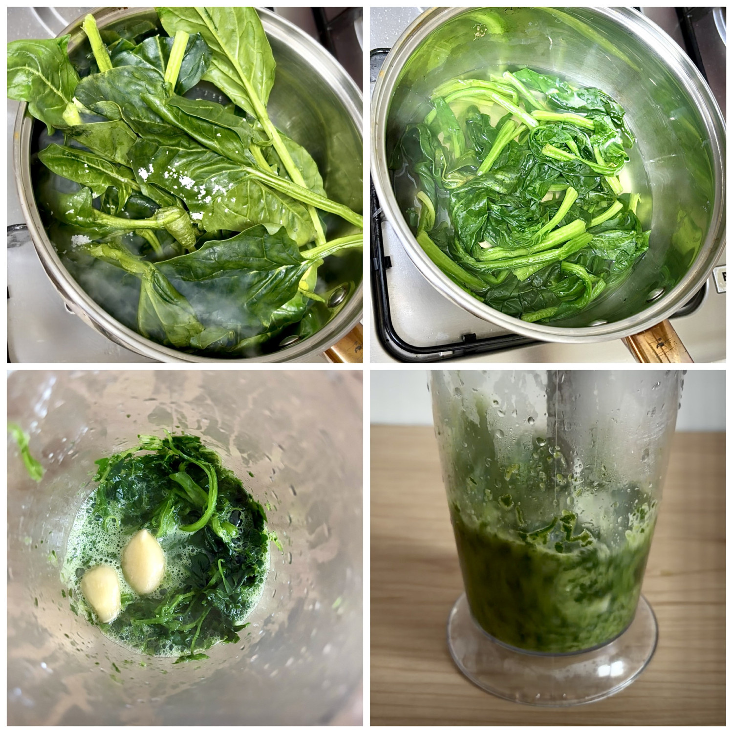 그다음 믹싱볼에 데친 시금치, 물 50ml, 마늘 3알을 넣고 곱게 갈아준 후 체에 걸러주세요