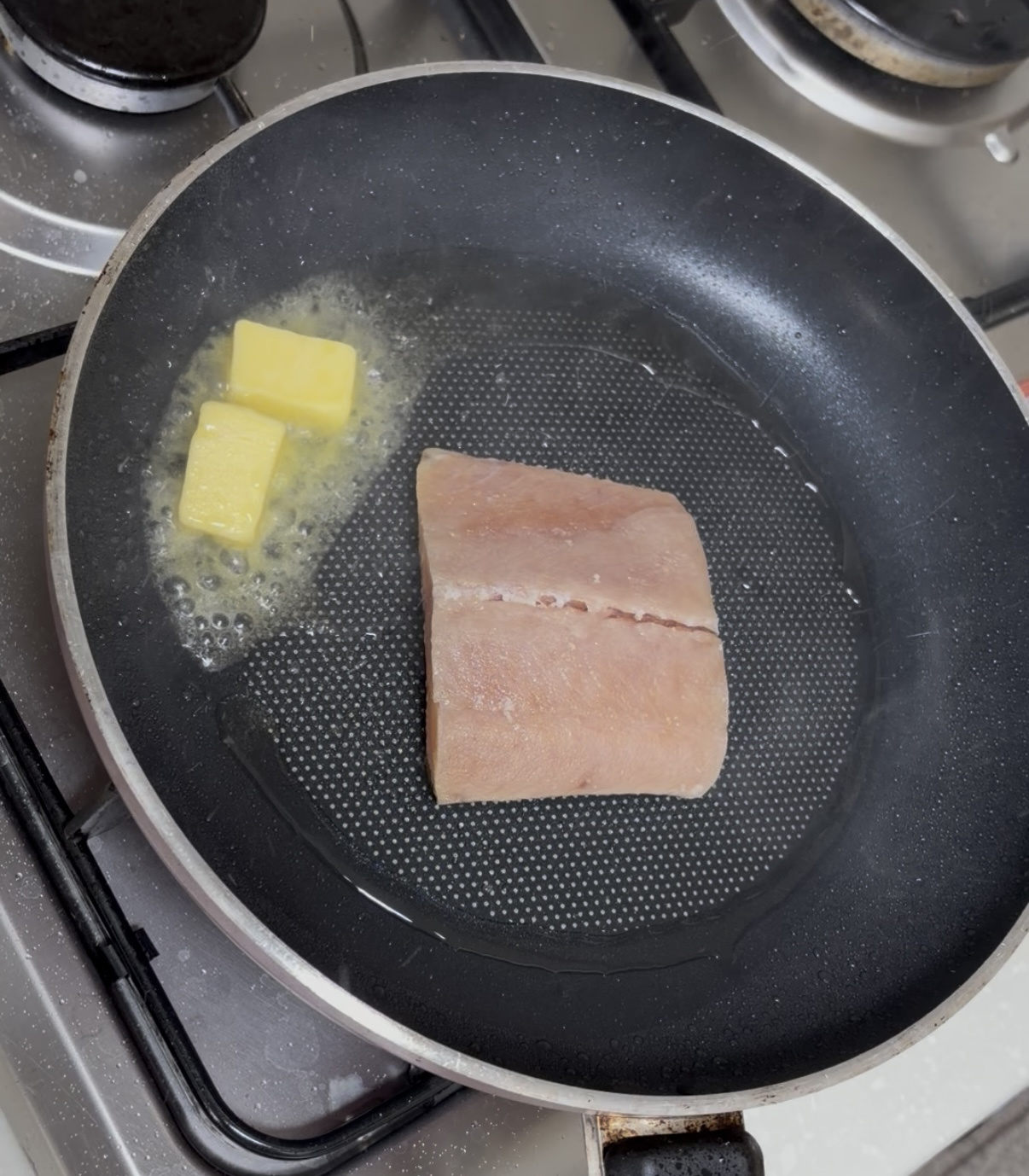 - 달군 팬에 올리브유를 넉넉히 두르고 연어, 버터를 넣고 노릇노릇하게 구워주세요