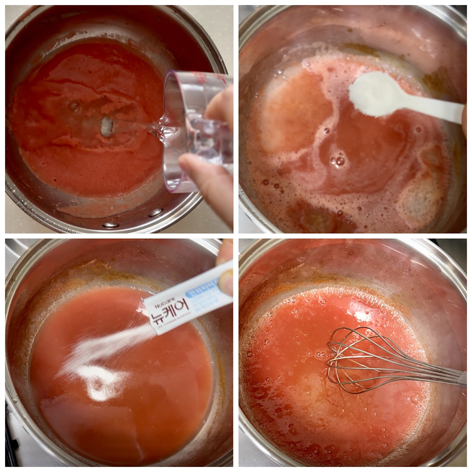 - 팬에 토마토 과즙, 물 30ml, 소금 약간을 넣어 중불로 끓고 온도가 85도 이상 올라오면 연하퍼펙트 푸디 1g을 넣고 잘 저어주세요