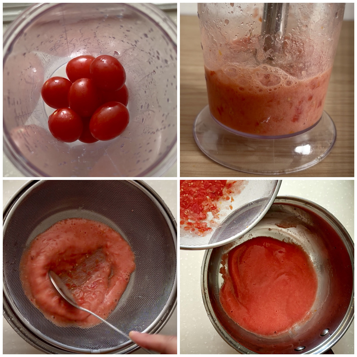 - 믹싱볼에 토마토를 넣고 곱게 갈아준 후 체에 걸러주세요