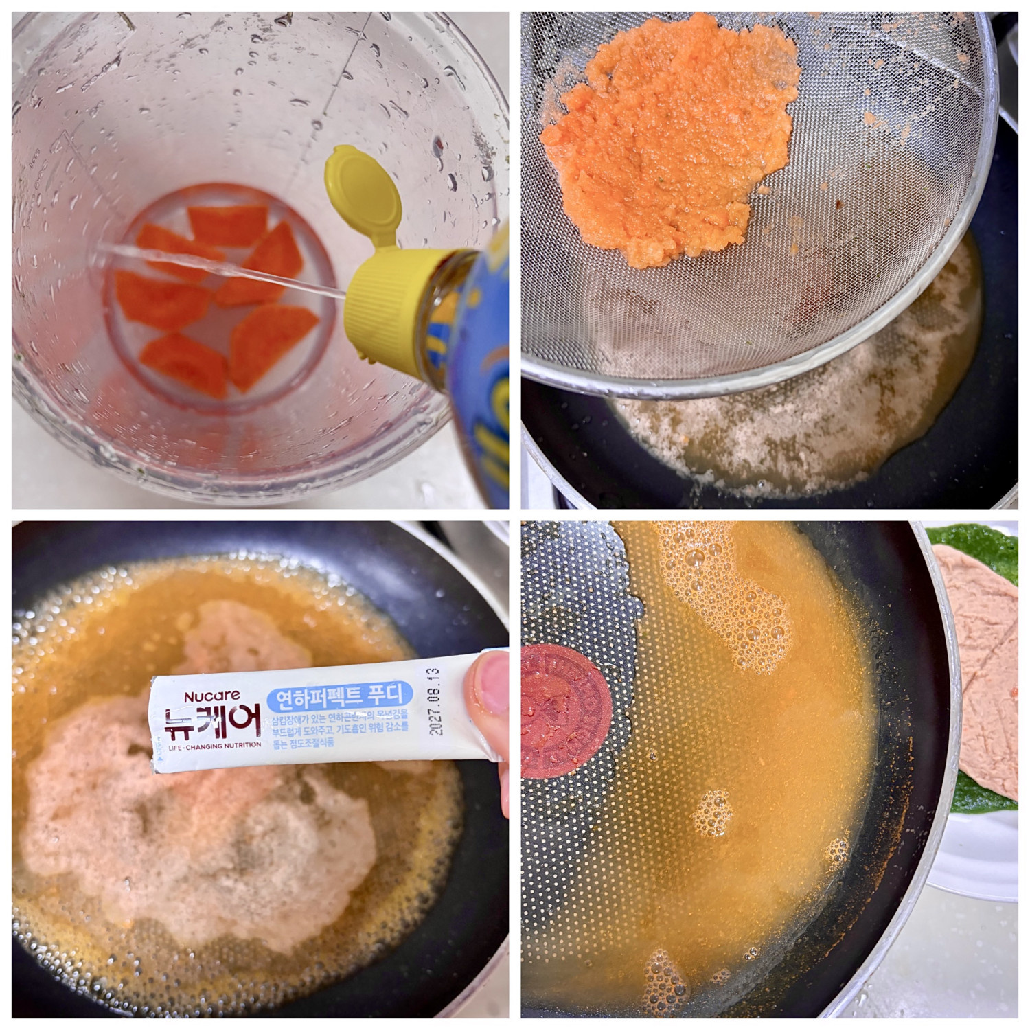 - 팬에 당근 주스를 넣고 온도가 85도 이상 올라오면 연하퍼펙트 푸디 1g을 넣고 잘 저어주세요