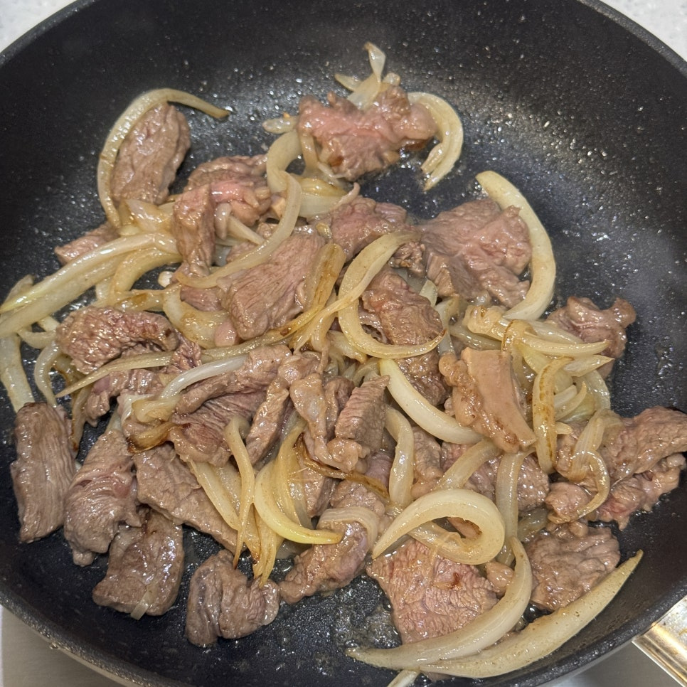 소고기는 겉면이 익을 정도만 살짝 볶아주세요. (너무 익으면 질기니까유~~)