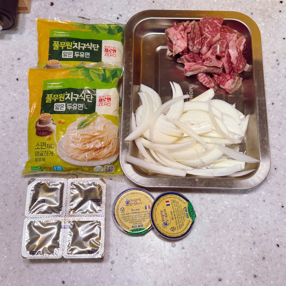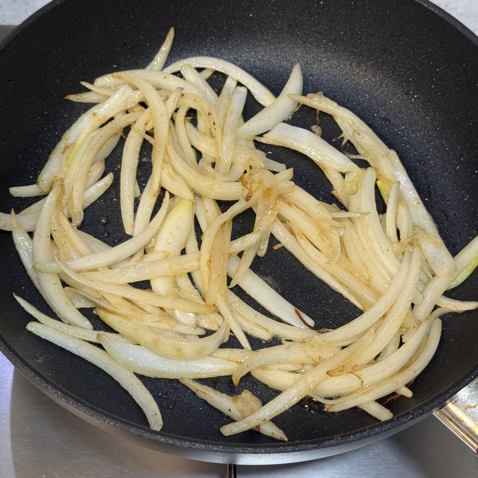 - 버터 2개를 팬에 녹인뒤, 채 썬 양파를 중불에서 갈색빛이 돌때까지 충분히 볶아줍니다.