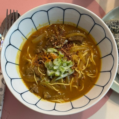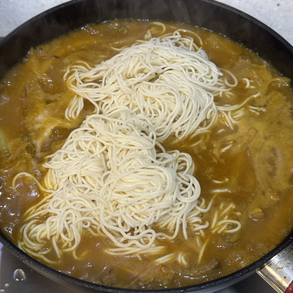 - 카레 국물이 보글보글 끓으면, 두유면을 넣고 살살 풀어주면서 20초정도 더 끓여준 뒤 마무리 합니다.