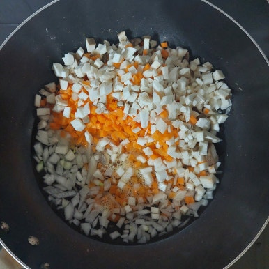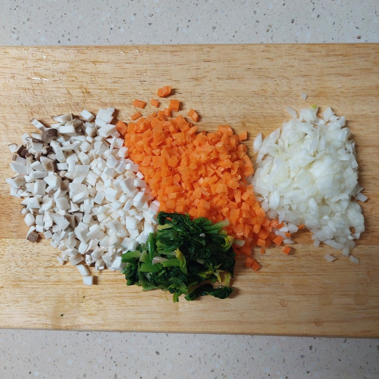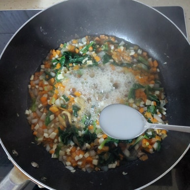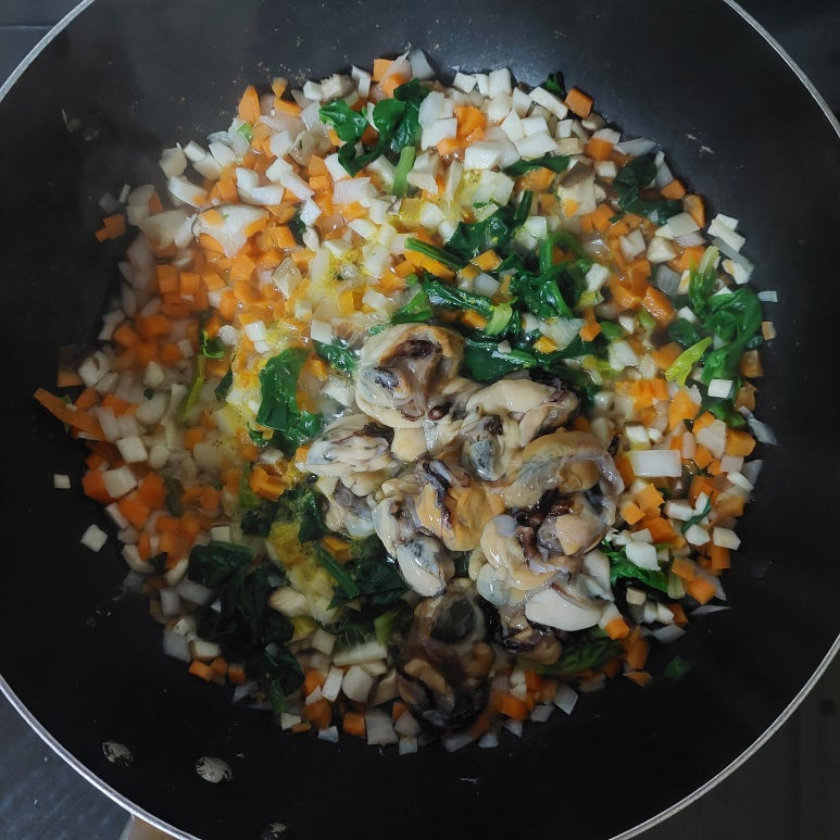 시금치 120 g , 양파 1/2 개 , 당근 1/2 개 , 새송이버섯 1 개 , 홍합살 200 g , 물 200 ml , 전분물 1 큰술 , 밥 2 공기