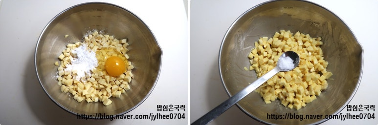 볼에 고구마와 달걀 1개, 감자전분